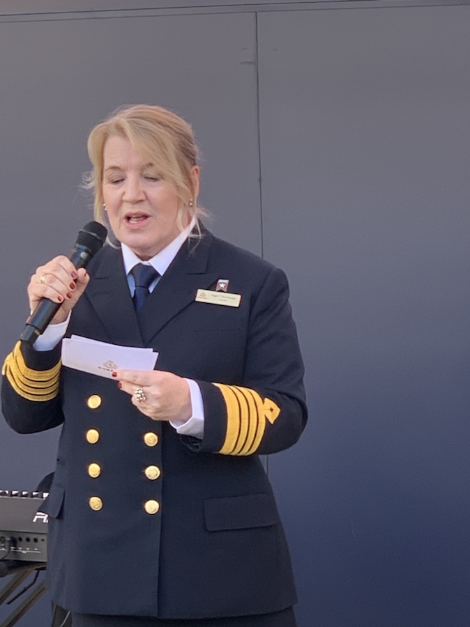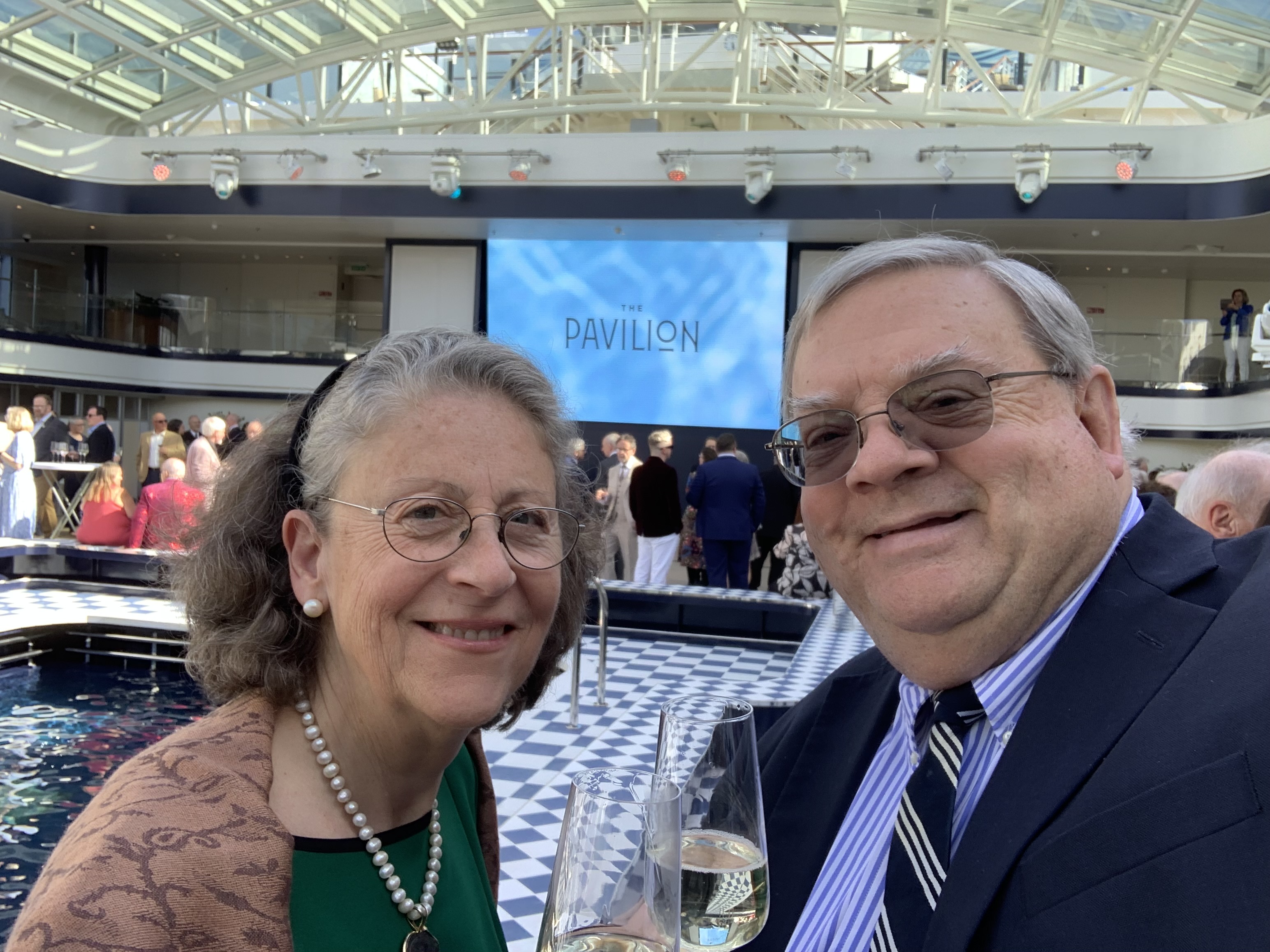 At 5:15 the Captain and crew invited us to a cocktail party around the pool area that has a retractable roof. As was usual, the guests with the most number of days on a Cunard Ship were honored. The winner was a lady who had a total of 1800+ days or about 5 years on Cunard ships! We have a long way to go to get to those levels!!