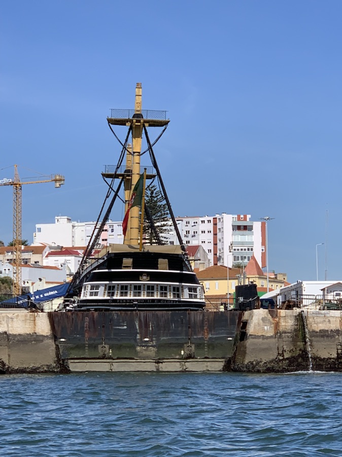 We then crossed the river to the southern side to see an old frigate that was built as a warship and travelled the equivalent of 5 times around the world, but never saw action. From there we continued along the southern coast and stopped in front of the statue of Christ. Near there one could see an external elevator that took people up and down the steep escarpment to the beach, from the residential area on top of the hills. We then passed under the 25th April bridge going out towards the Atlantic Ocean, topping in front of a fascinating building that looked like an eye lid with a central eye, just peaking out of the ground. It is the Museum of Modern Art and Architecture. Next to that is a building resembling a ship that is the center of research for cancer and other diseases. Other stops included the fort / prison of the Belem Tower, the Museum of Electricity, the Monument to Discovery, with the statues of the famous Portuguese explorers along what appears to be the bow of a concrete ship setting out to sea. The final stop was opposite the main square – a very impressive 3 sided (the 4th is open to the River) set of identical white and yellow buildings, outside cafe’s, a central pillar and statue and a gate leading to the old part of the city. This was all reconstructed after the big earthquake that destroyed this part of town. We returned to the embarkation place, for the end of the tour. The 2 people in the front seats followed by Anne got off the vessel with no problem, but I made a true spectacle of myself not quite balanced, landing belly first on the quay, with legs thrashing around over the water and resembled a beached whale!!!! An amusing adventure for all who observed it, and other than a bit of embarrassment, I was soon on my feet and off to the rest of the adventures for the day.