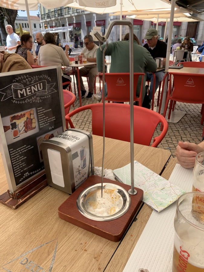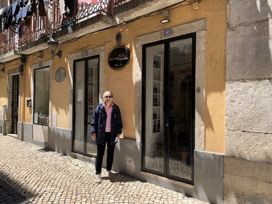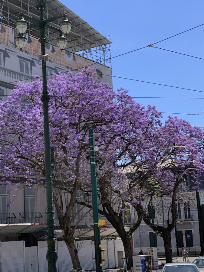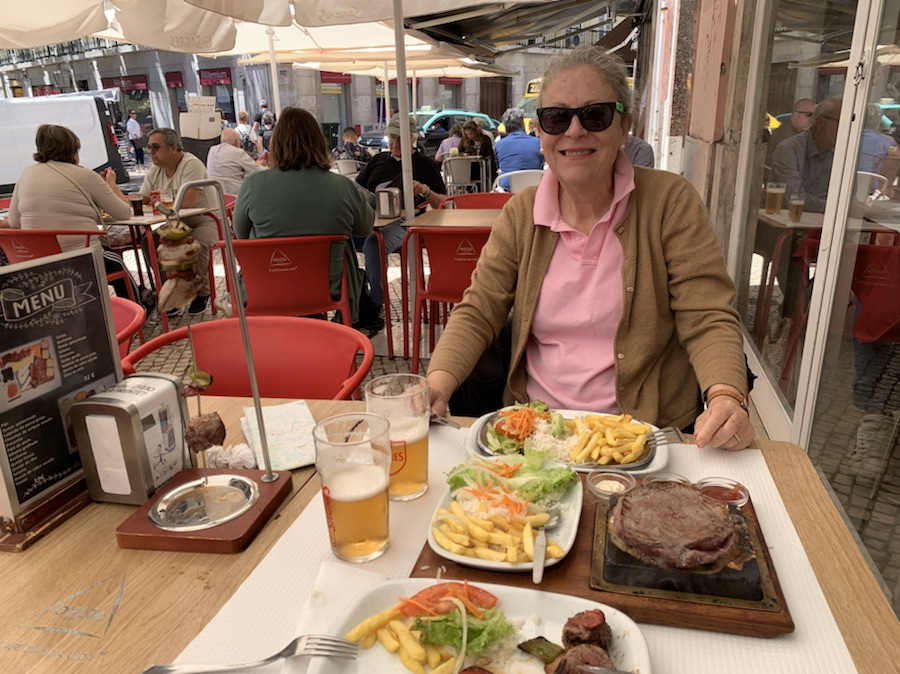 It was a gorgeous sunny warm day, so we wandered over to the main square, where last time we had eaten in one of the sidewalk cafe’s and continued on to the left of the square (back to the river) and up the hills, meandering through the streets, stopping when we felt like it and ultimately found a nice little park with spectacular Jacaranda trees in full bloom, where we decided to sit at a table in the shade of the trees and enjoy a nice local brew. We continued our wandering, with a vague goal of looking for the Wine / Port tasting restaurant that Anne and her sisters had found during their “Sister’s trip” many years ago. It is called “The Old Pharmacy” as in its prior incarnation it was indeed a pharmacy, but now the shelves of medication were filled with a more enjoyable elixir!! After some asking, pointing and many left and right turns, we found the place on Rua do Diário de Noticias. Unfortunately it was closed, but we did look through the windows and Anne was able to reminisce of the fun times they had there. By this time it was 1:30PM and time to find a place for lunch. As we started down the steep hill, we were thankful it was not raining as we are sure it would be very slippery, we came upon a small plaza with an outside restaurant called “Sagres”. We ordered and soon were tucking into local Beer and two meat dishes which we shared each accompanied by salad, rice and fried potatoes. One was a Shish-Kebab on a skewer which was suspended vertically over a metal plate (for the drippings) by an arm on top of a post. We enjoyed the beef, sausage, and veggie mix. The other meat dish consisted of a raw piece of beef that was on top of a red-hot black stone and lots of garlic on top. You could cook the meat to your liking, so we turned it over, searing it together with the garlic and then butterflied it and cooked the inside. A fascinating and delicious meal. While eating we realized that we had inadvertently left a shopping bag of local trinkets at the beer stop at the top of the hill. Anne volunteered to go to the top of the hill to retrieve it while I wandered around “Municipal Square” that was on our way back to the ship. Anne was able to retrieve the bag and once reunited, we wandered back to the ship. However, since we had “been deprived” of a desert and knowing of an excellent Gelateria on the main square we indulged ourselves not only with mint, pistacho and mango ice cream, we also had mango and passion fruit smoothies. A superb way to end the visit to this fabulous city. We were glad that we had walked some 11 1/2 Kilometers, to at least partially defray the caloric indulgence.