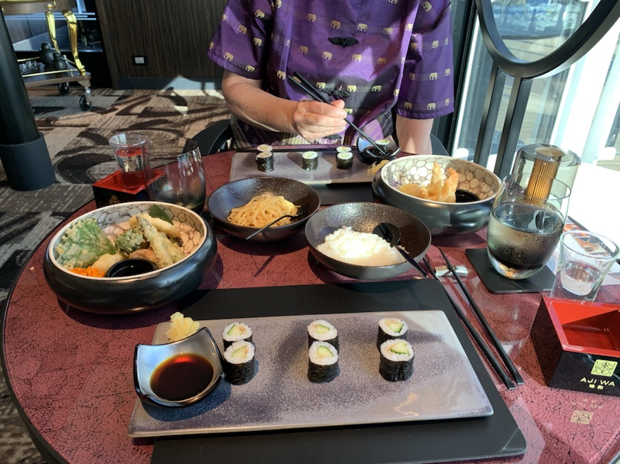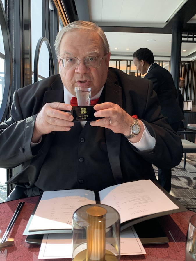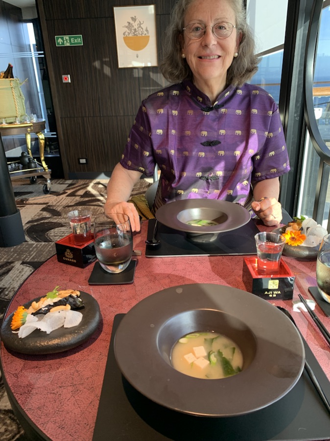 In the afternoon, Anne went to the gym and I wandered up and down the decks, looking for the viewing point of the bridge on each of the top 6 decks. This mission ended in failure and I believe it does not exist, but other interesting places that we had not explored before on the ship were found. This included hitting a few golf balls into a net and putting on the 6 hole putting green. We had made reservations to have dinner (thanks to an invitation from our travel agent – Howard) at the Japanese Restaurant – Ají Wa on the 10th Deck A. We had a delicious dinner of Sushi, Miso soup, Tempura, Green Tea Roll cake and Matcha Green Tea. Ekatarina (Katia) our friend the sommelier, gave us a personal education about the 40 types of Saki that are carried on board the ship. We learned a great deal, including the fact that Cunard owns and produces its own rice fields and brewery in Japan. We had to taste the Gold Cunard Saki, which was delicious, smooth texture and really superb. The polite way of serving it is to put the glass into a small rice measuring lacquer box and pour the sake into the glass so it overflows and goes into the box. A sign of generosity, by giving you more than you asked for. After holding the box in both hands and sipping the glass until it was 1/2 empty, one removes the glass and then also consumes the rest that has fallen into the lacquer box. Some Sake types are to be served cold, others warm, and a third type in between. Many people still think that it should be drunk warm, but there is also a vestige of the era when the poorer quality was served warm to help disguise the poor quality. With the Macha Green Tea, we also enjoyed a special aged and fruity flavored Sake that is under the only foreign (English) Sake Master, Philip ???, in Japan, who has won Gold medals for his Sake.