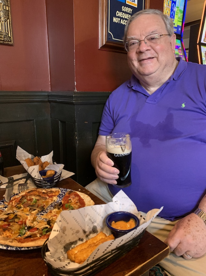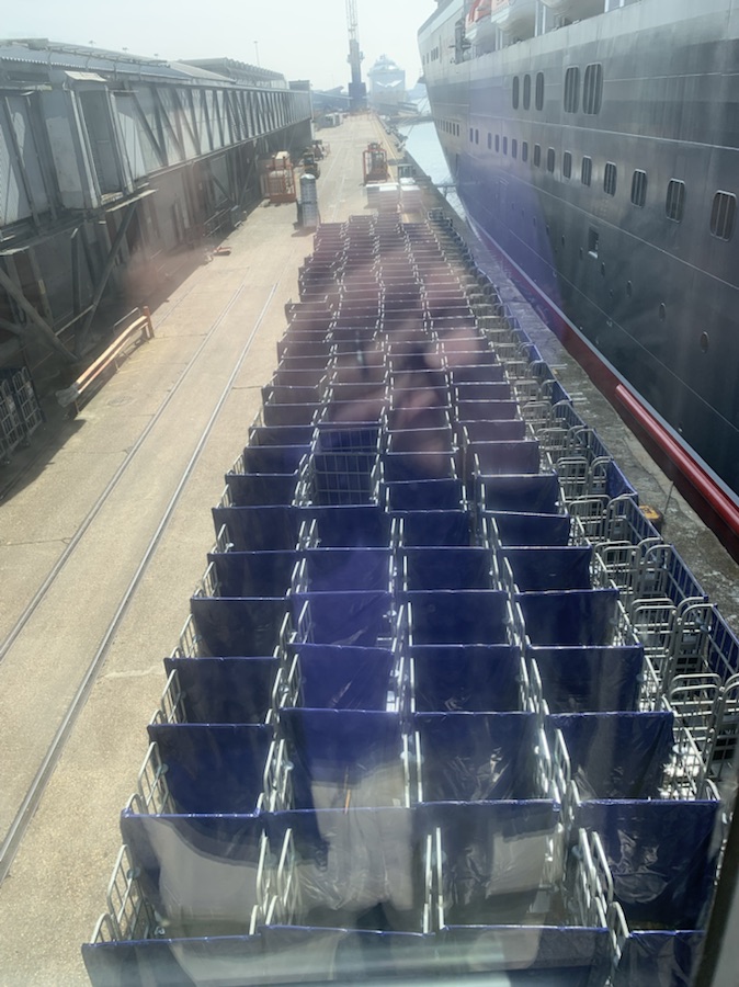 We took our time getting off the ship so as not to get caught up with virtually all the passengers getting off the ship after the maiden voyage, which was very successful, Once outside, we looked for the shuttle bus to take us into town, but finding none, we walked into town found where the shuttle can be caught to return – on the street between IKEA and the WestQuay Shopping Center. We wandered through the parking lot and shopping center and found a large Gastro-pub, which we had been to before, on the High Street called The Standing Order. Next time we will try another one we were recommended – The Red Lion or even the White Star. After a nice lunch and some Guinness, we returned to the shopping center and purchased a few odds and ends we needed, then walked back to the ship covering in total for the day some 19,880 steps or 13.52 Kilometers. Upon our return we headed straight to the cafeteria for drinks of water and tea. It was a glorious sunny warm day, which we greatly enjoyed. After dinner we went to the show, passing by to try and chat with Philip (of Faberge Egg fame) that we got to know well last year, but he was busy with customers. The show was 4 soprano women in Red long dresses – The Pop Opera Royalty (as they refer to themselves) called IDA. Very good voices and I believe we have seen before. All in all another nice day with lots of walking.