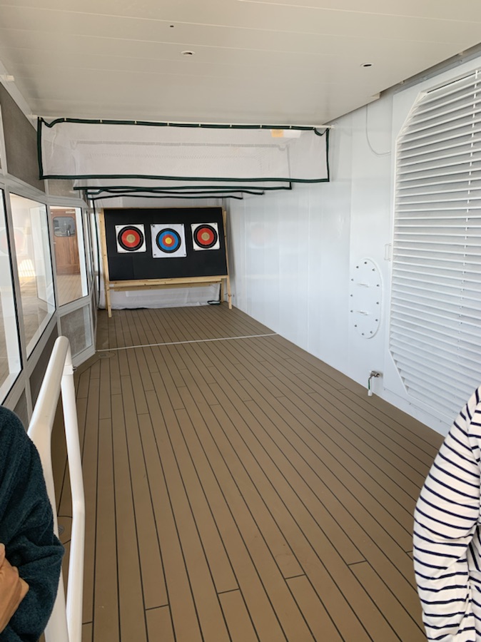 We had read in the program that there was a sign up for Archery at sea, so after ordering lunch at the pub, I went to do the sign up thinking it was a couple of minutes. In actuality some 50 people were there and were required to watch a safety video and complete forms, measurements taken for arrow length and dominant eye etc. I rushed the process telling them that I had been an Archery teacher and needed to get back to my wife and lunch. So being the last one into the presentation I was the first one out and was told to report at 3PM by the Pool. There is an area on the 10th deck that is enclosed by glass and is an Archery shooting range for 3 people at a time. There were supposed to be 6 of us but one did not appear, so we went with the instructor to the area and he asked if any of the 5 of us had ever shot a bow and arrow before. It turns out that 3 of us were or had been instructors. It was fun as we each got to let a dozen arrows fly from the nice composite bows. In the 1960’s I had done a lot of competitive archery and training in England. At the time, and I am sure it is still the law of the land, that every male over the age of 18 had to do at least one hour of archery a week. These laws get left on the books and not repealed, but are forgotten when no longer of material use. I then taught Archery at the British High School in Mexico where I was the Physics, Chemistry and Biology teacher in the early 1970’s. It was fun to do that again.