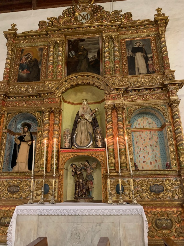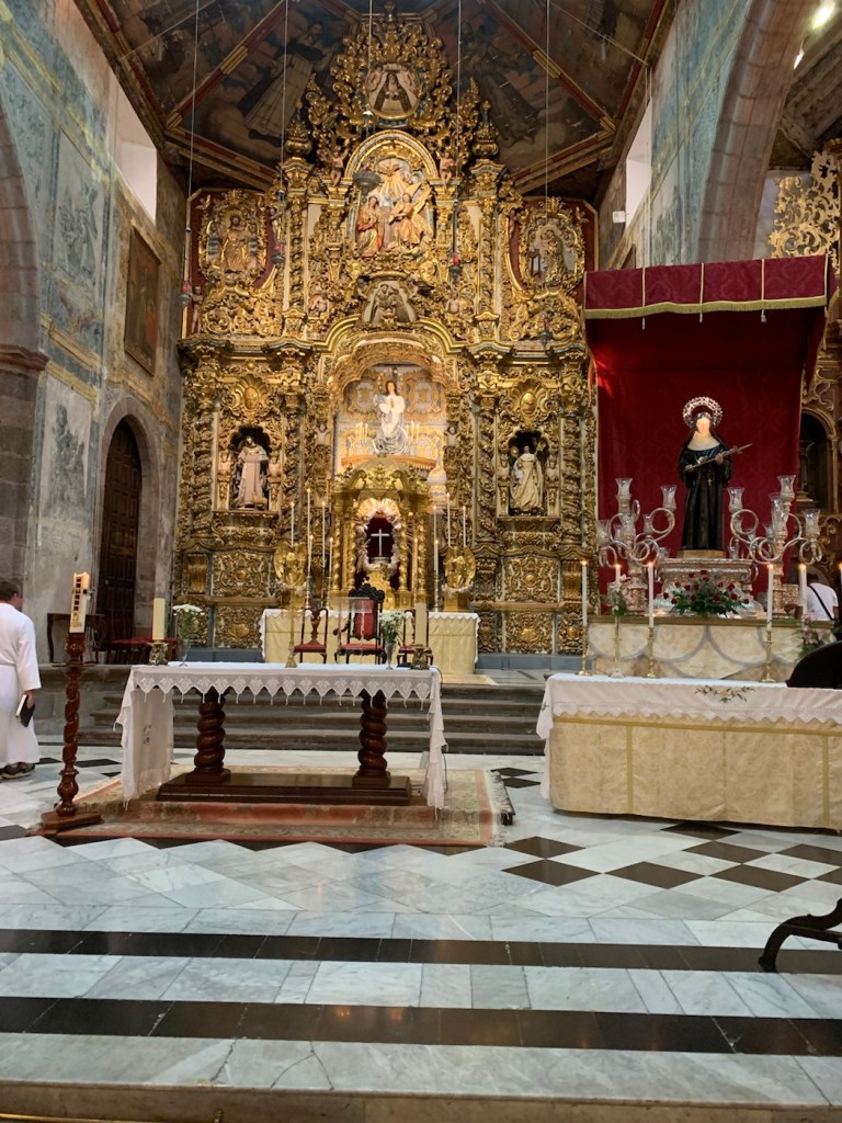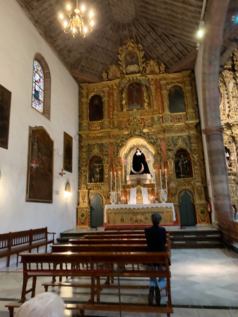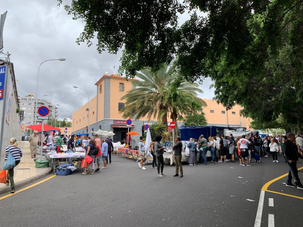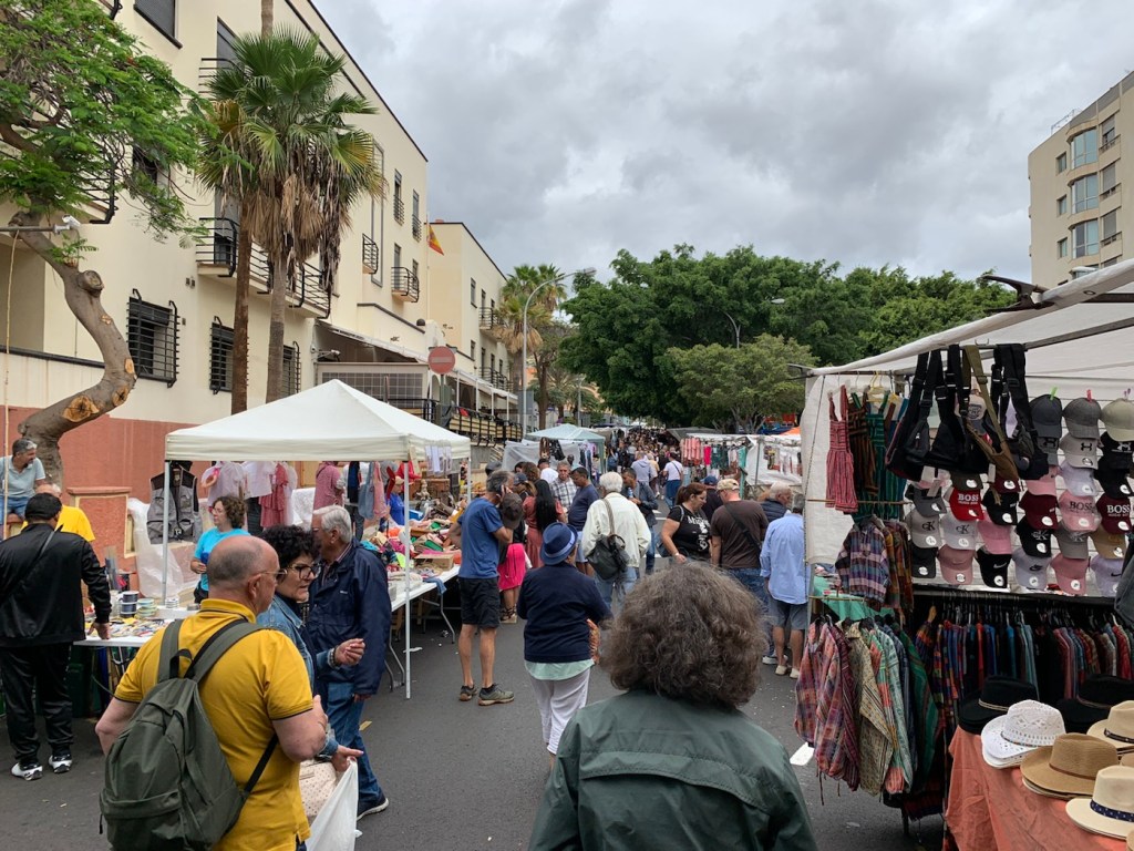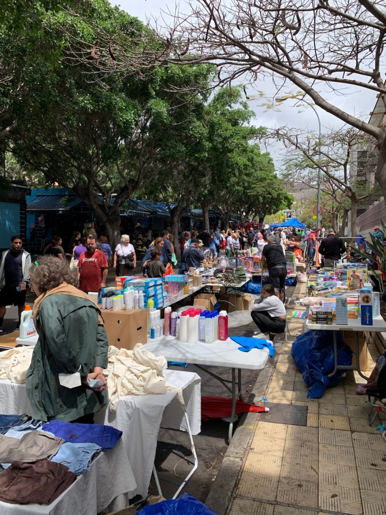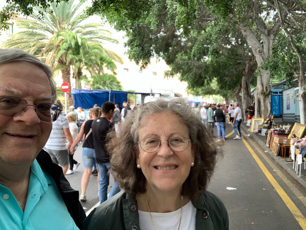 Today after breakfast in the Britania, where we had a chance to see and chat with Nikolai, we left on our own after all of the crowds had boarded their coaches and walked up a couple of side streets to find the Catholic Church that Anne had found – of the Parish of Saint Francis (La Parroquia de San Francisco) and being Pentecost Sunday it was an important day to be attending church. It is a very attractive church very ornate, which is uncommon amongst the Franciscan Order but really gorgeous. The microphone system wasn’t working well so it was difficult to understand the priest, but we were able to have a nice church service. Being Sunday, as we started wandering around the streets, we found that many of the shops and cafes were not really open. We managed to enjoy a coffee at one place that was open, and eventually found a pedestrian street (Alfonso Betancourt) where we had had a very nice meal last time (April 19, 2023). We found that restaurant – Lateral 27 – but it was all closed up being Sunday. We then wondered around and eventually walked over a bridge (Salvador Valentin Sanz) and found a thriving market (Mercado de Nuestra Señora de Africa – La Renova). Inside the building, they were the usual stalls selling meat, chickens, vegetables, and so on and the place was crowded with locals all getting their food for the week or at least for the day. Just outside the building for about four or five blocks there was an open air market where anybody could put up a little tent and sell whatever they happen to want to sell. There were clothes stalls, coins, old tools, telephones, antiques, paintings, indeed anything you could possibly think of including fake Rolex watches, fake designer clothing, and so on. Lots of fun to be amongst the local people wandering around looking for a bargain, or that special item. As we walked through the market, we found a luggage stall and decided we needed to replace the suitcase (from Malaysia) that had been broken when we boarded the ship a couple weeks ago. We really only needed the large one, but we bought the three all nesting inside each other so for the rest of the afternoon we were wheeling that around, but it wasn’t too bad as all we were doing was going to have a meal and then getting back to the ship.