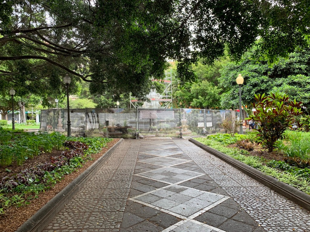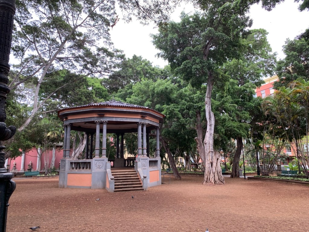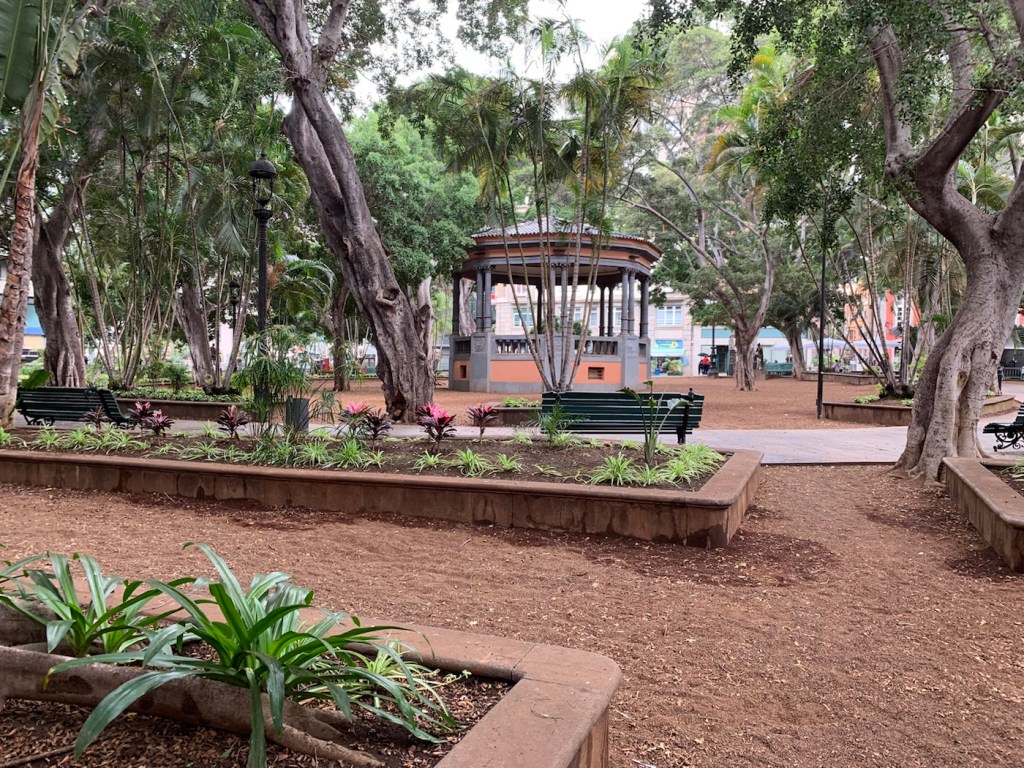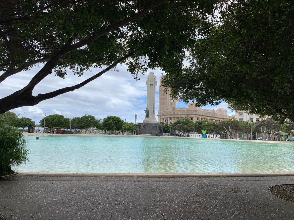 Today Sunday, we are in Santa Cruz Tenerife Spain, and as we have been here before we opted not to take any tours and go on a short walk into town, find a church as it was Sunday, and wander around and see what there was to see. A fun day, totally different from the rush, rush, rush of the tours of other cities, enjoying a wander around the town. Santa Cruz de Tenerife is the capital city of the island of Tenerife, which is the largest and the most populated island of the seven principal Canary Islands having a landmass of over 2 thousand square kilometers and just under 1 million inhabitants, which is about 43% of the total population of the Canary Islands. We docked, port to the dock on the inner harbour dock, which is always better as one can easily walk into town. Last year we docked on the outer dock on the larger Queen Mary II, and had to take a five minute shuttle bus to the entrance of the port as we were not permitted to walk from the dockside to the entrance of the port. From the entrance to the port area, there are a couple of bridges over a busy dual carriageway and you’re right in the center of town. The Plaza España, one of the principal squares in town, has a large circular pond and very attractively done with some monuments and cafes.