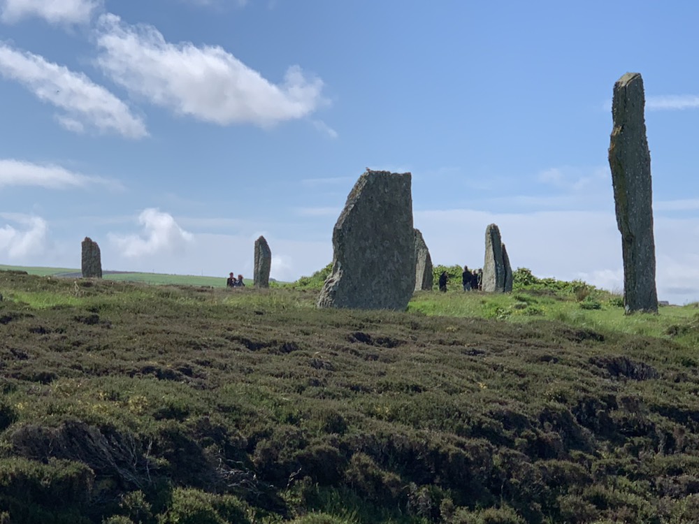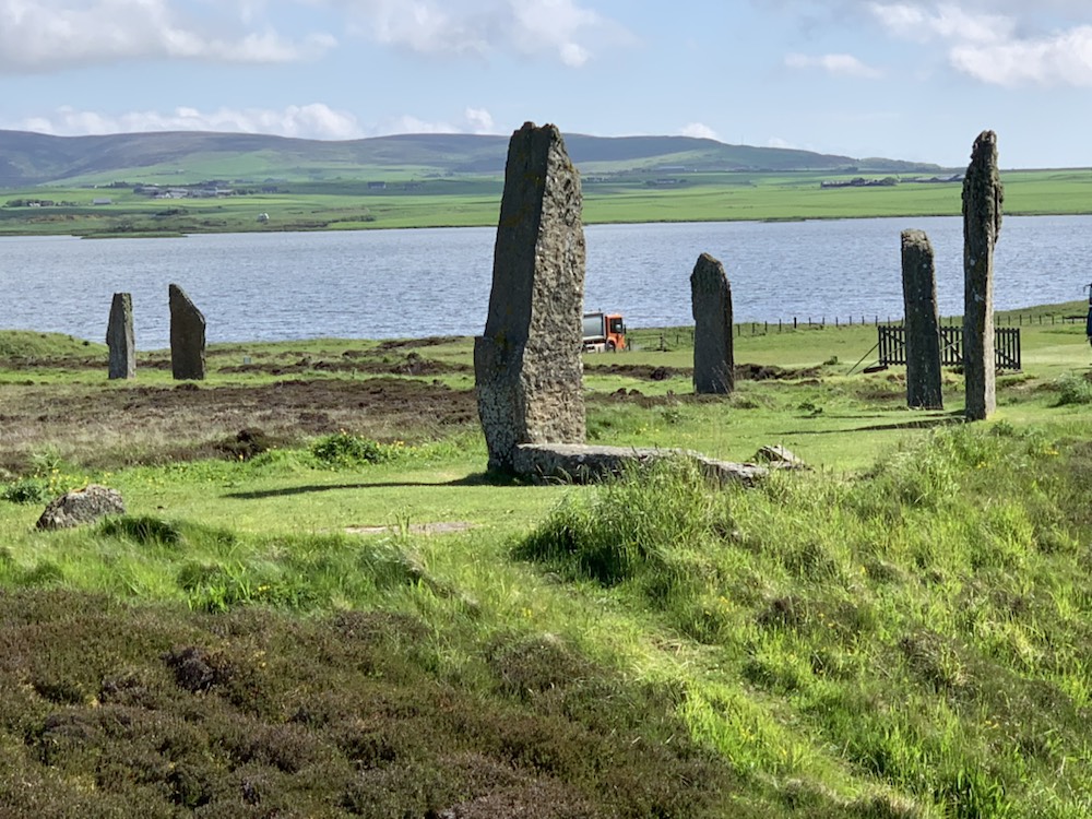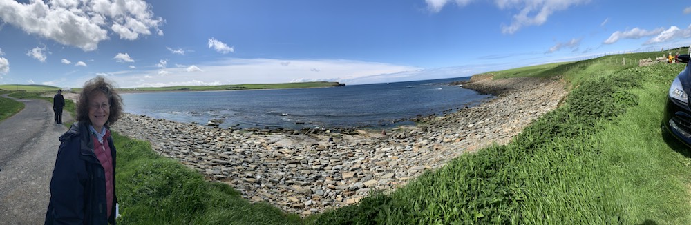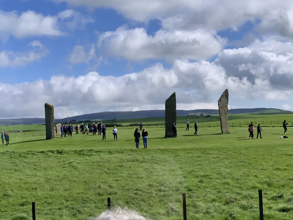 We berthed, Starboard to dock and were greeted by bagpipe music, a sign saying Welcome Queen Anne to Kirkwall. We boarded coach 11 with an Austrian young lady guide who had met a Scotsman in Canada at Divinity School, they were married and after their first child was born 11 years ago they decided to move back to Europe and her husband being a Pastor, was assigned 9 years ago to a parish in Kirkwall, where their second child was born. She knew her stories and did a very dood job of explaining things and keeping all moving along. The tour – Cliffs and Rocks was a bit misleading,but one of the key stops was at the “Ring of Brodgar”.