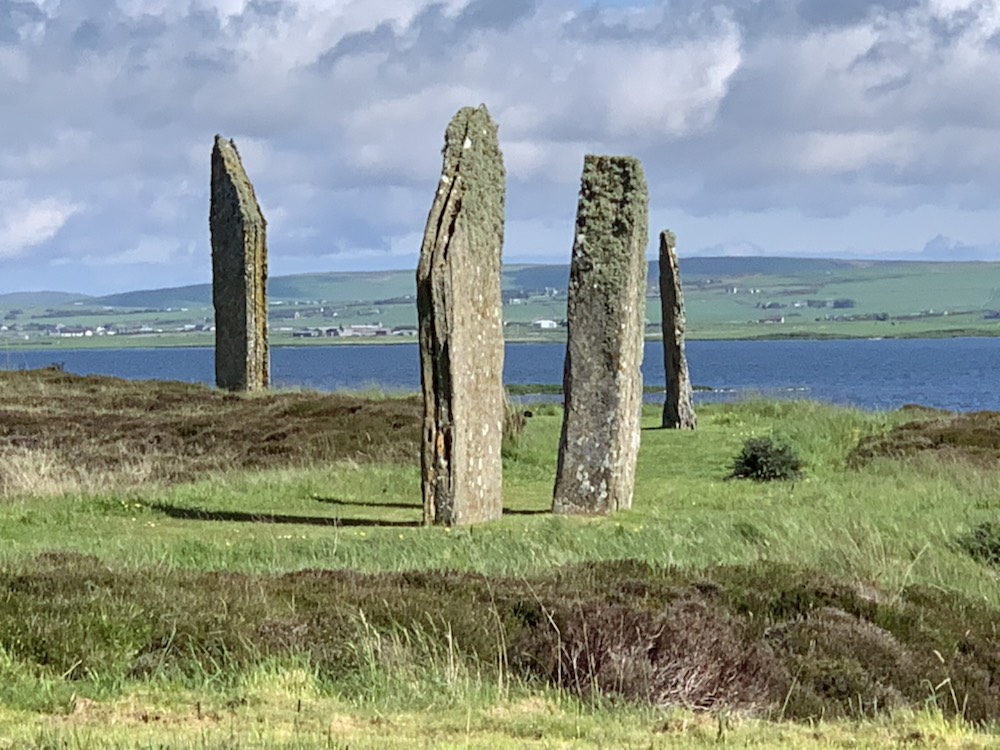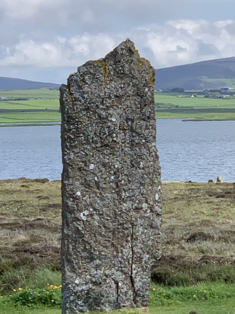In 1999 UNESCO inscribed the area as a World Heritage Site, Neolithic Orkney. It is comprised of Skara Brae (a village with houses, stone furniture that gives an insight into daily life); Maeshowe Chambered Tomb (a chambered tomb set on a circular platform and aligned so the sun lights up the central chamber on Midwinter setting sun, and contains one of the longest Rhune texts in existence); the Standing Stones of Stenness (one of the oldest stone circles in the country dating back some 5,000 years); and the Ring of Brodgar. The ring sits in a natural amphitheater surrounded by hills and two lochs – Stenness Loch with its brackish water and Harray Loche with fresh water. It dates to the Neolithic or early Bronze Age as the only firm dates – 2600 – 2400 BCE are from the ditch that surrounds it. The ditch is 4 meters deep and 10 meters wide and took 80,000 man hours to build (100 people, 10 hours a day for 80 days) There appear to have been 60 stones or more, but today there are only 36 of which 21 are still standing. The central part is closed to visitors, but one can walk all around the outside of the circle and marvel at these rocks which despite only being burried some 1/2 to 1 meter, are not blown over by the strong winter winds.