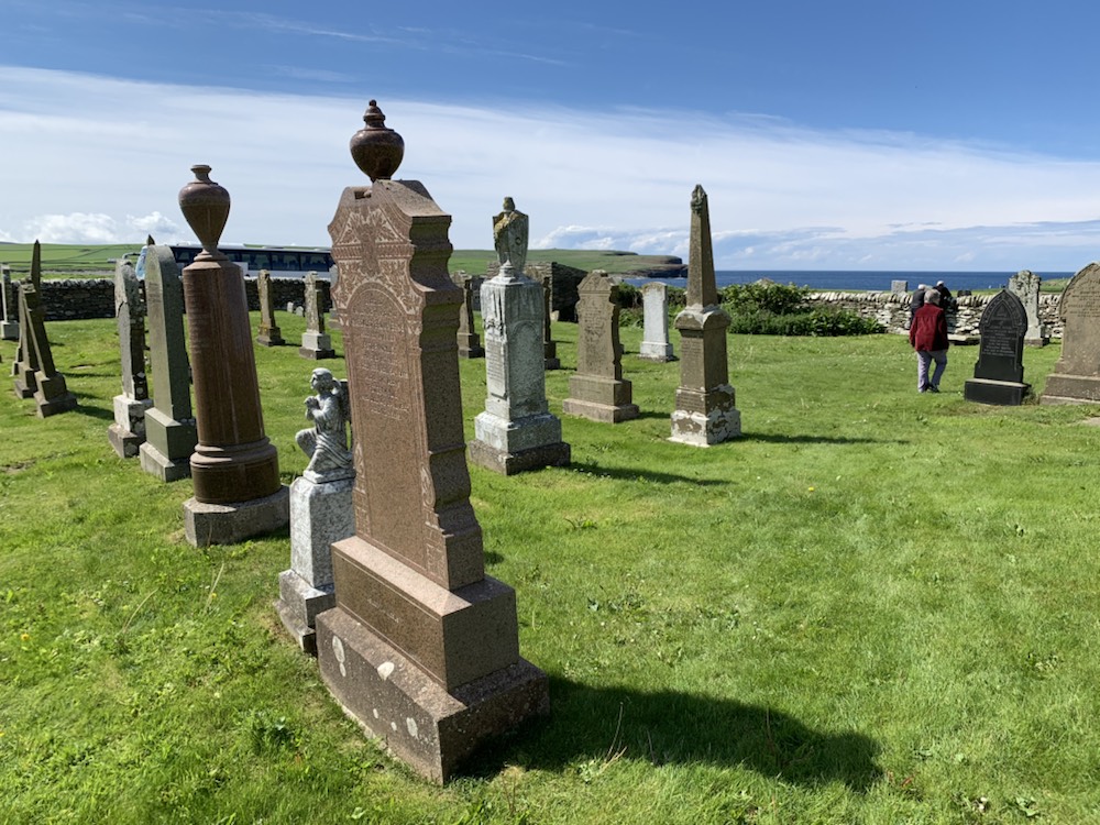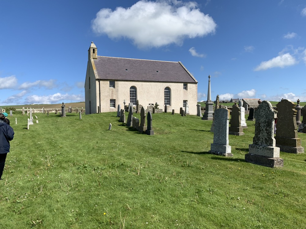 After leaving there we went to a viewpoint with cliffs and circular (stony) beach, which was beautiful and entered the Church of St. Peter in Sandwick overlooking the Bay of Skaill with its extensive graveyard, many of whom died during the world wars. It was rebuilt focusing on the raised pulpit and is now seldom if ever used.