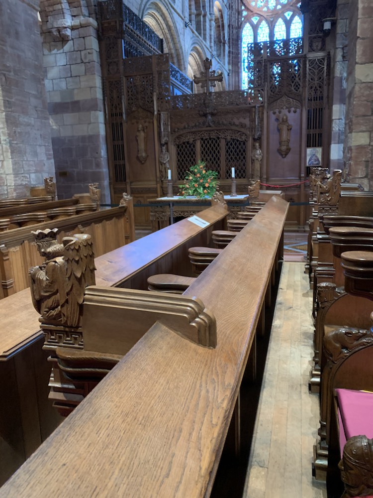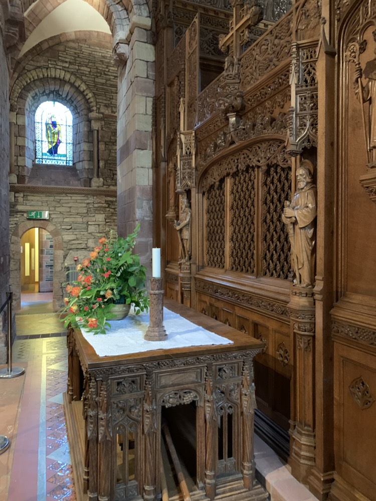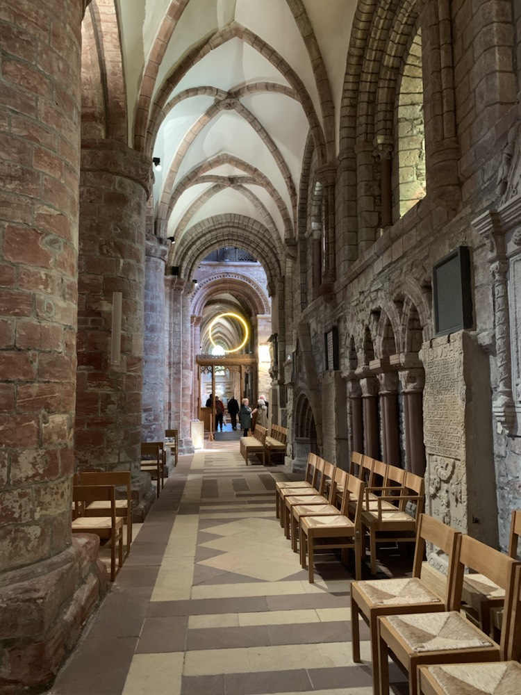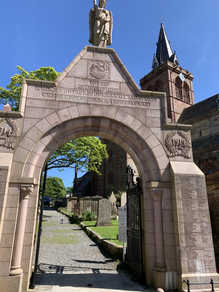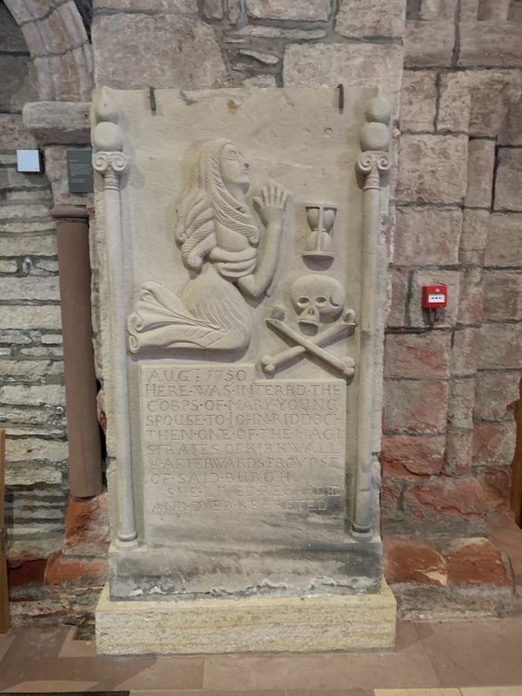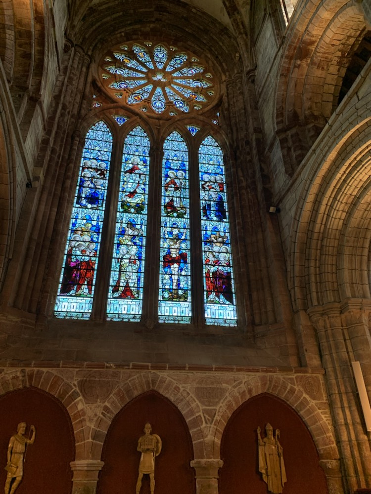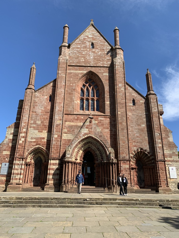 After getting back on the coach we drove past a cliff that the waves have formed a horizontal hole allowing one to see the Loch through the cliff opening. We got back to the ship and immediately took the 10 minute shuttle (4 miles) into the Town of Kirkwall where we found a nice pub – The Ola Hotel and Restaurant on the seafront and enjoyed a meal. After a bit of shopping, tasting the local ice cream (as there are so many cows – main industry other than tourism) and a visit to the St Magnus Cathedral – the most impressive sandstone building in town. Magnus Erlendsson was the Earl of Orkney in the early 1100’s which he shared with his cousin Hakon. Hakon eventually got his cook Lifolf to kill Magnus. He is buried in Birsay, and stories of miracles at his grave started. His nephew Earl Rognvald (originally Kali) came from Norway to claim his mortal remains, promising to create a “stone minster and a place of pilgrimage in honor of his Uncle”. In 1137 the cathedral was founded and the remains of Magnus were brought back to Kirkwall. A few years later, those of Rognvald (killed in 1158) were also brought and both are interred in the cathedral within the walls of the Choir. Initially the Cathederal was part of the Archdiocese of Nidaros (in Trondheim, Norway) which we visited last year. Orkney became part of Scotland in 1468 and the Cathederal was given to the people of Kirkwall by the Scottish King James III. Today it is part of the Church of Scotland, but under special arrangement can be used by any Christian denomination.