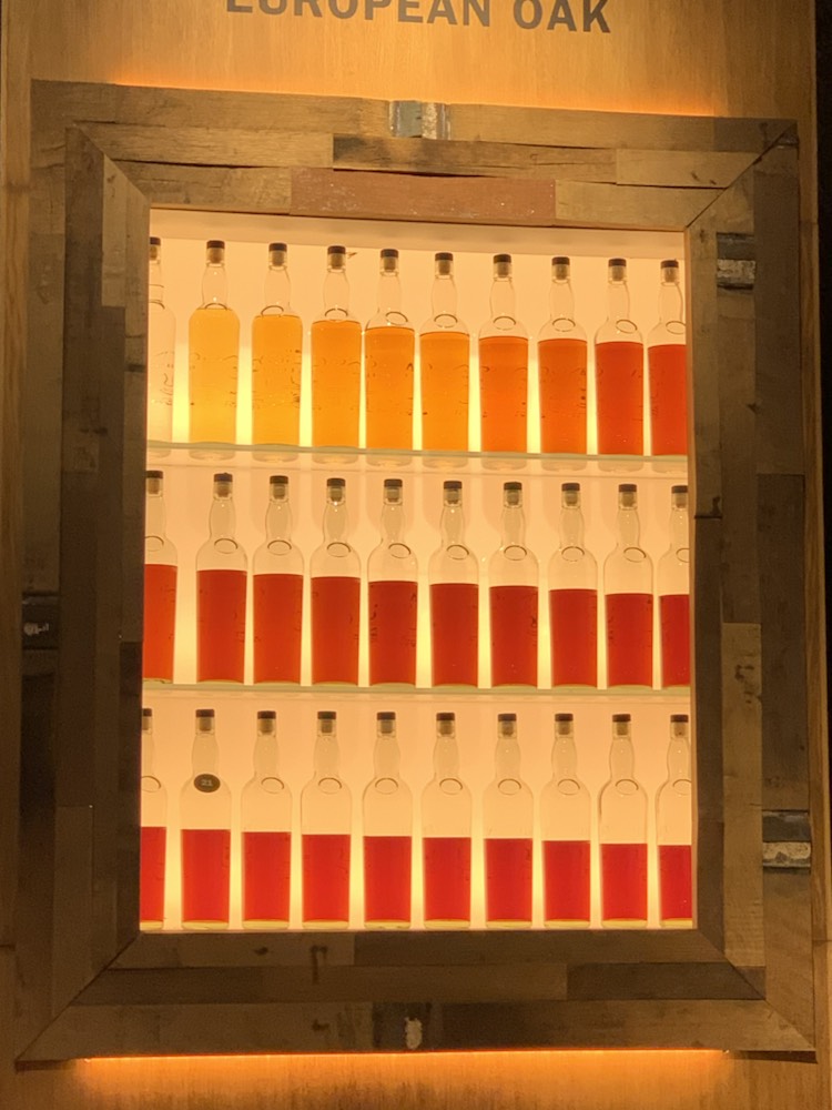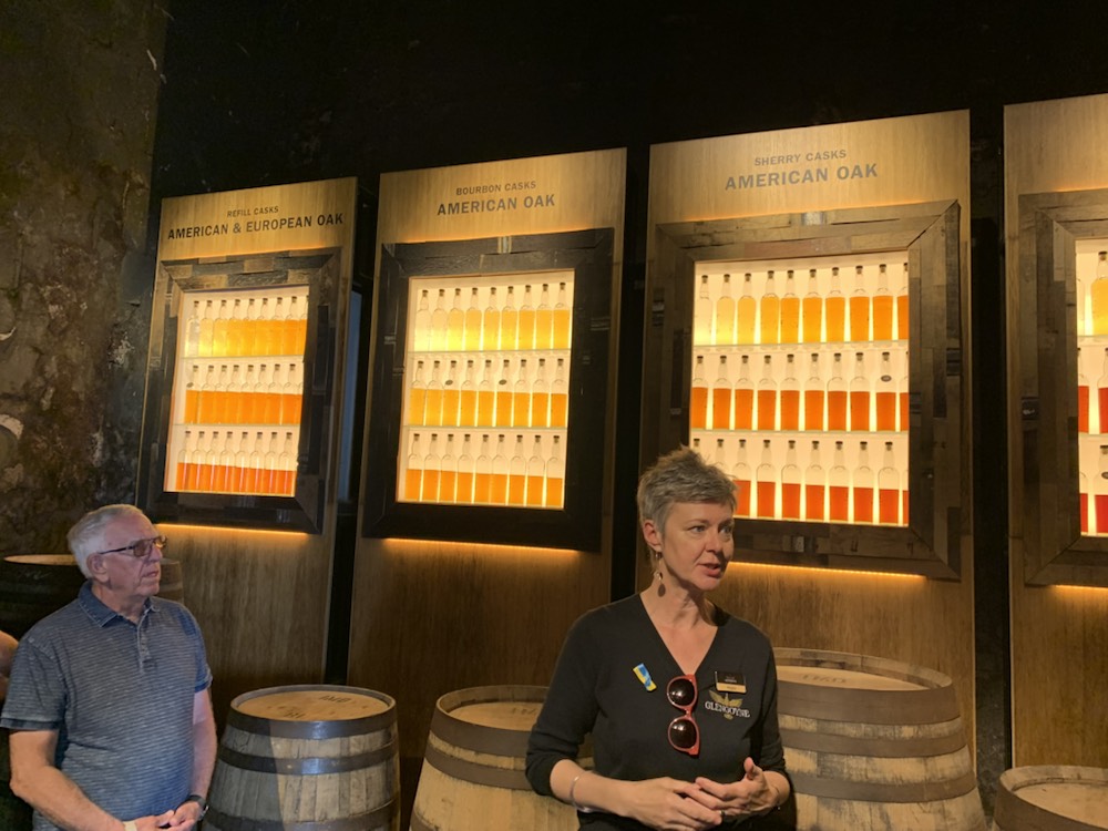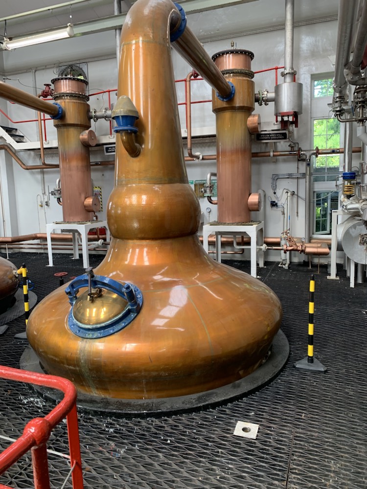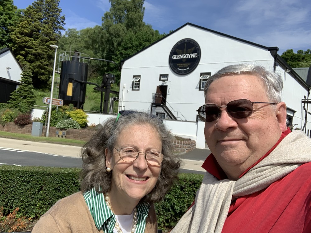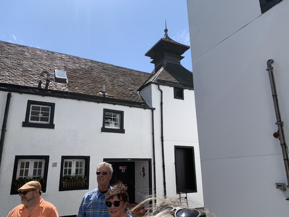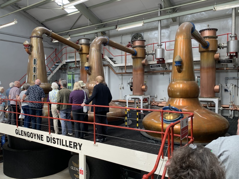 We stopped at the Glengoyne Distillery. We parked the coach on one side of the road, which by definition was “The Lowlands” and that’s where the whisky is aged . We crossed the road to “The Highlands” where the whisky is distilled! There are five types of Whisky defined by area – Highlands, Lowlands, Speyside, Isley and one other. To be considered Single Malt Scottish Whisky (NOTE Scotland spells it Whisky whereas other countries spell it Whiskey) has to come from Malted Barley from Scotland, Aged a minimum of 3 years and 1 day (in case one is not a leap year) in oak casks not exceeding 700 liters each, contain only 3 ingredients – Barley, Water and Yeast and distilled in Pot Stills at a single distillery. So how to make it? – First, Scottish Barley is “Malted” – soaked in water for 3 days allowing it to sprout to get the conversion of starches into sugars. The barley is spread out and regularly turned, before it goes into a cloth, hung in a “kiln” with a Pagoda roof and heated from the bottom to dry it out. The heat source may be hot air, as in Glengoyne, or with Peat used as a heat source (mostly used in Isley) which provides the “peaty / smoky” flavor (actually phenols) into the whisky. The malt is then milled into coarse flour and water at about 60-655C added so as to extract the sugars. The sugar water (Wort) is then sieved out and higher temperature water 70-75C is added to extract even more sugar, although less than the first run, still useful. A third run at 85-90C (near boiling) is then added to extract the last bits of sugar. Although not much in this last batch, it is used for the first “bath” of the next batch. The spent malted Barley, now with no sugar, is collected (while we were there) by a local farmer who uses it as cattle feed. This wort (sugar water) is then put into large oak barrel like structures (thousands of liters) where yeast is added, to start the conversion of the sugar into alcohol and giving off Carbon Dioxide. This fermentation takes about three days and produces a liquid with a low (Ethanol) alcohol content of 5-7%. This then goes to the Pot Still, where it is heated and the alcohol,gets into steam and then cooled to return it to a liquid state. The copper still for this first distillation had a a lower large globe like pot and a second wide “belly” like ring, where the heavier (unwanted) steam is returned to the pot allowing only the lighter Ethanol to move to the next stage. At this point the liquid has an alcohol content of 20-30%. Still not good enough. So it goes through another distillation in copper pots, bringing it up to 60-70% Alcohol (120-140 proof). At this point the clear liquid may be diluted to 60-62% before putting it into Oak barrels for aging a minimum of 3 years and 1 days, but mostly aged for 10 -15 years or more years. Of note is that the first few minutes of the distilled alcohol at the final stage is put into a separate container as well as the last bit of the distillate (known as heads and tails) and only the best central part is used, much like a fish, where the heads and tails are cut off and the center bit is what one eats. These heads and tails are added to the next batch to try and squeeze as much good alcohol out as possible. It is up to the key whisky maker to review each barrel to determine if it has reached perfection or whether it can go an additional year. Some may age 20+ years. The key though in the aging is the type of Oak used for the Barril. All the ones at this distillery are ones that were used for maturing sherry and then re-used for whisky. If European Oak is used, it produces a deeper color, and spicer flavor, although it is more porous creating greater evaporation. This Evaporation is called the “Angel’s take”! American Oak produces softer flavors (sweet citrus, vanilla, fresh fruits, honey) and less color and is less porous, thus less “Angel’s share”. Sometimes the barrils are reused (refill casks) and they produce different tastes and colors. Used American Oak Bourbon Casks are sometimes used. Each imparting a slightly different flavor and color. Once the master has determined that certain barrels can be used, they are carefully blended, to produce a color and flavor that is the standard for that particular distillery and aging. At this point water may be added so as to produce bottle strength of 40-45% alcohol by volume (a.b.v) or 80-90 proof. Only alcohol from that particular distillery, may be used in this blend. Blended Whisky’s like Johnny Walker, Chivas Regal etc use whisky distilled from many distilleries to produce a unique blend. On occasion, Cask Strength may be consumed or, as in the case of “The Scotch Malt Whiskey Society”, based in Leith and Edinburgh with a venue in London, they buy Casks from each of the 136 distilleries and bottle them specifically for their members. Depending on the cask it usually produces about 300 bottles and once those have gone, that’s then end of that particular taste. When the Society was formed (I am a member) the distilleries were reluctant to sell caskets that may have different tastes from what to expect from that particular distillery. So the society agreed to have all whisky bottled in identical green bottles and the labels are restricted to have a group of numbers. These number codes are provided to members. And consist of AAA.ZZZ where AAA represents the distillery and ZZZ the cask number purchased from that distillery. So say Distillery ABC has a number 52 (I use that number as the distillery is no longer in existence), that means it it the 52nd distillery from which the Society has purchased a cask. If the second number is 67 that means that it is the 67th cask that the society has purchased from distillery 52. The number then on the bottle would read 52.67. The Society provides tastings all over Great Britain. After we learned all about the production process, we samples a wee dram of the 10 and 12 y