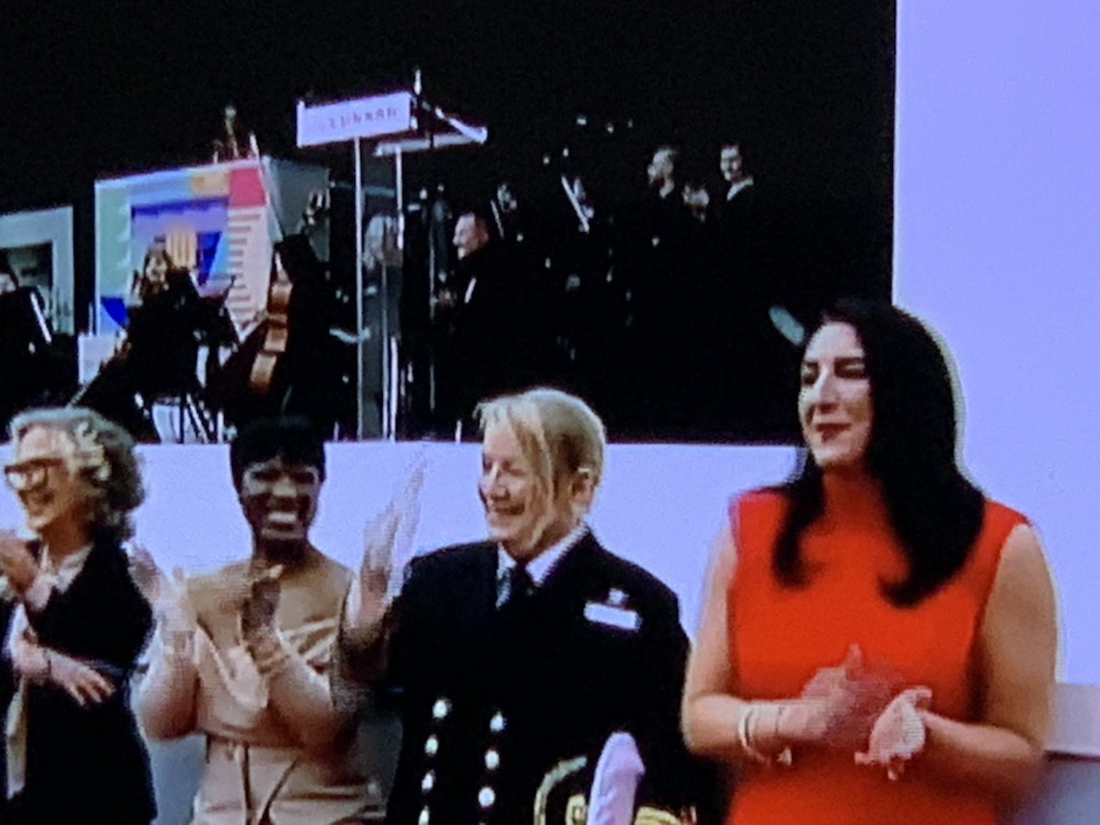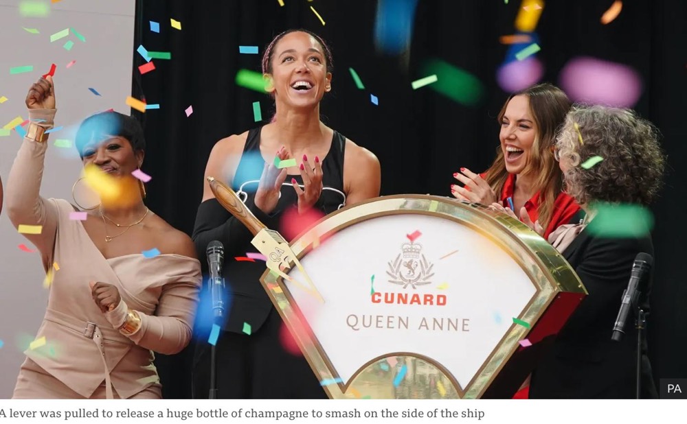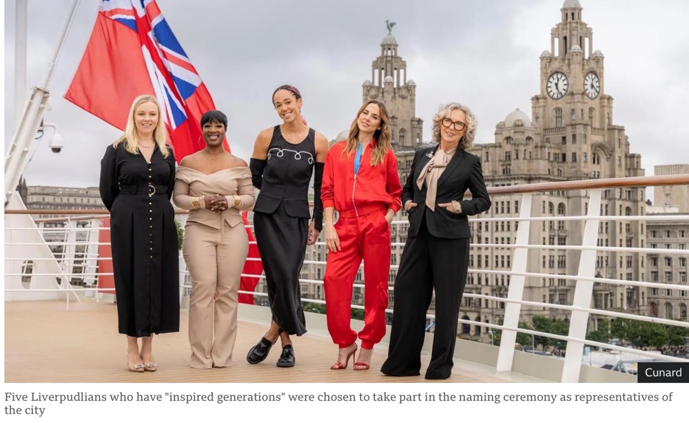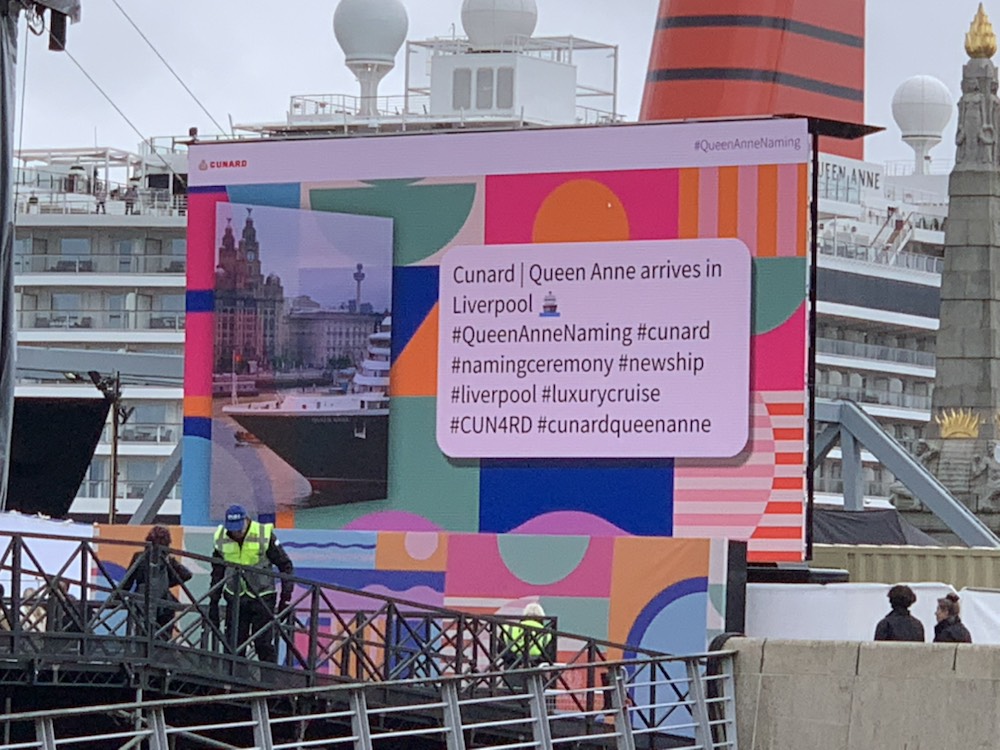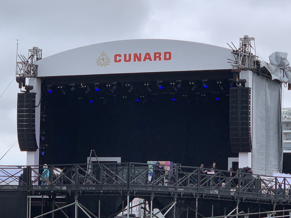 The events started as planned with the introduction of a well-known DJ – Lauren Lo Sung, then the Philharmonic of Liverpool and the Masters of Ceremony – TV Personalities Emma and Matt Willis. This was followed by speeches by the President of Cunard – Katie McAlister and the Captain – Inga Thorhauge, and the “Godparent“ of the ship was officially named – The People of Liverpool. This is usually a person and we had hoped it would be Princess Anne or one of the Royal Family. Instead there were five women from the community that were the representatives of “the people of Liverpool” that did the official naming and throwing the switch which let off the 18 liter bottle of champagne which broke – officially setting it off with all the crowd shouting – God save this ship and all who sail Therein. The leaders of the community were – The Spice Girl and Author – Melanie C; Broadcaster and Community Leader – Ngunan Adamu; Restaurant Entrepreneur – Natalie Haywood; Liverpool Musical and Cultural Legend – Jayne Casey and British Olympian Heptathlete – Katarina Johnson-Thompson. Since all the key people were women, it definitely was interesting and “Men need not apply”!!!!!