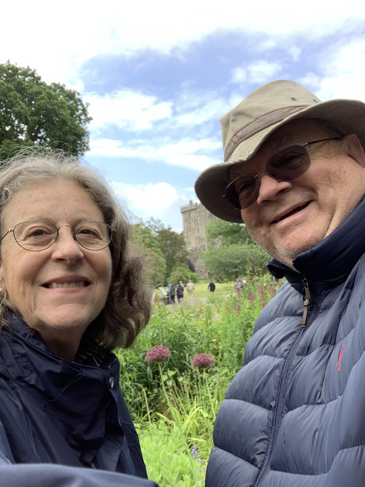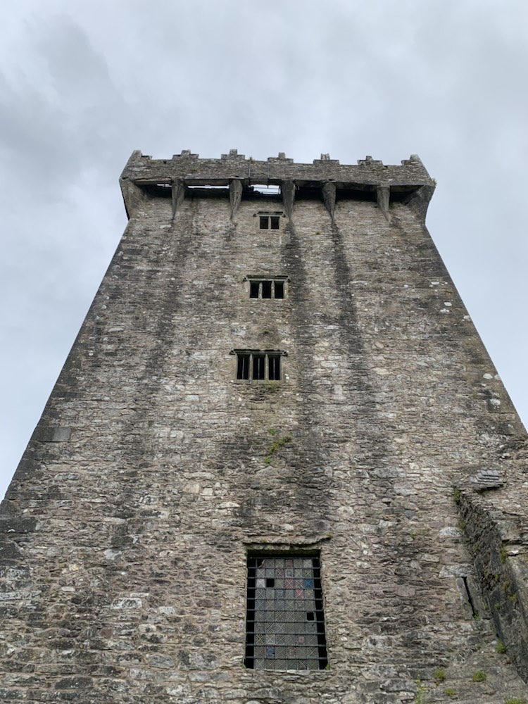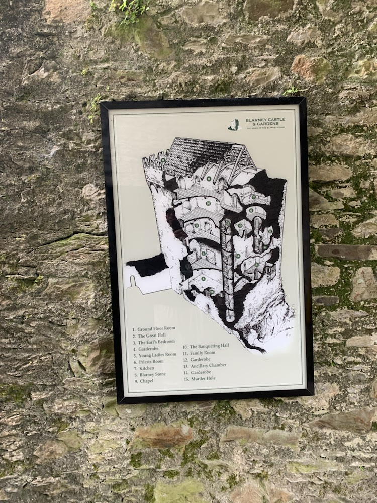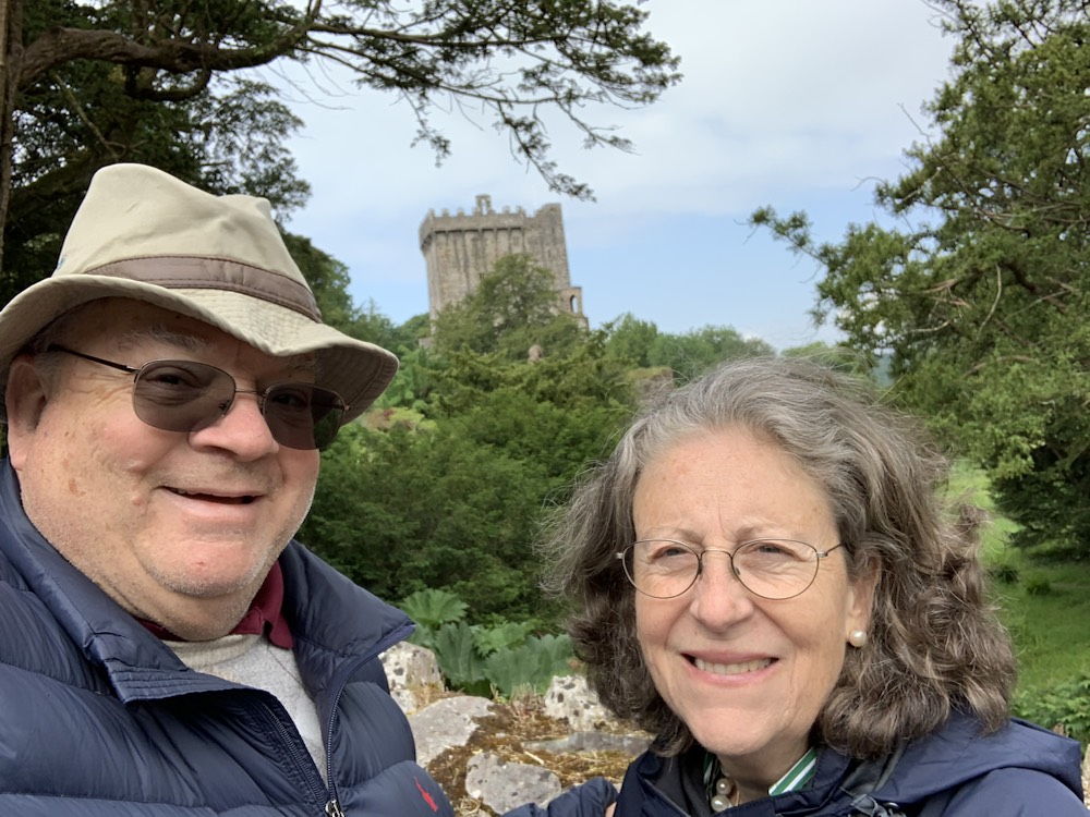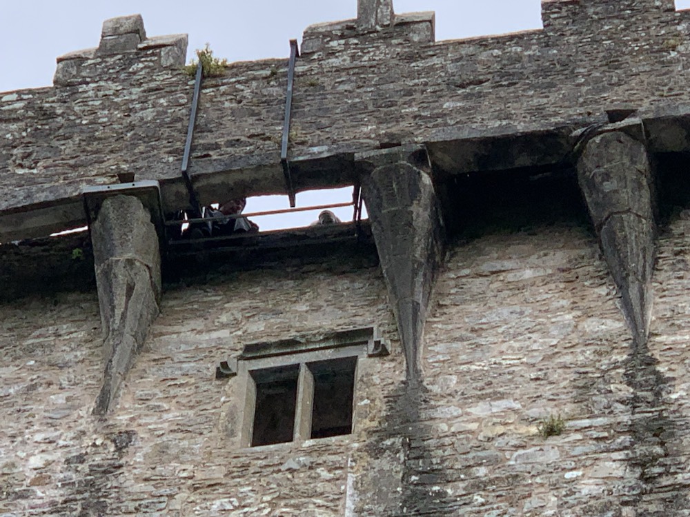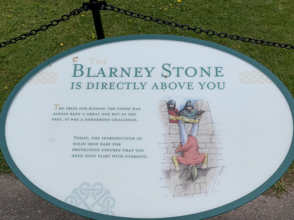 Blarney castle (8 miles from Cork – Phone 021438-5252; info@blarneycastle.ie; http://www.blarneycastle.ie; open year round 9-5, a bit later in the summer) and gardens stretches over 60 acres and the first structure to be built here in the 10th century was a wooden hunting lodge. Around 1210 a stone structure was built , which was demolished and the foundations in 1446, Dermot McCarthy built the Tower House or Fortress Residence is what we know today as Blarney Castle. The Blarney stone’s origin is not clear. Some believe it to be Jacob’s Pillow, brought to Ireland by the Prophet Jeremiah. It became the seat on which kings were crowned. Others prefer the story that Cormac McCarthy, King of Munster sent four thousand men in support of Robert the Bruce to the Battle of Bannockburn in 1314 in which he defeated the English. The stone was a gift. Years later a witch was saved from drowning in the lake on the property and she granted or revealed its sacred powers to the McCarthys. Whatever the origin, it was place high above the castle on the outside ramparts, where it is today and if you have the nerve to kiss it, you will be endowed with the gift of eloquence. I say the nerve as the first part is to climb over 100 very narrow steps in a narrow circular pattern which is highly claustrophobic. Once you start there is no way out other than going to the top and down a separate staircase. Towards the top the inner part of the stair is barely an inch or so wide and the outside is wide enough for a foot sideways. A rope attached to the wall is the only thing that saves you from falling and knocking over, like ten pin bowling, all the others making the track behind you. Waits of 90 minutes from the entrance to the stone at the top are not uncommon. You have now completed the easy part of the experience. The view from the top of the castle is spectacular. As you make your way around the parapet walk towards the stone you start seeing the reason for the concern. To kiss the Blarney Stone, you have to lie down on your back, hold onto metal railings. That are on the outer parapet wall, then shimmy your body so that about half – the top pathfinders to the waist – is stretched out over the wall and down the outside wall with a 90 foot (27 meter) drop to the stone below, then reach out and under the external wall to kiss the stone. In fairness, there is a man helping to keep you “safe”, holding the legs that are still on “solid ground”!!! Once kissed, you still need the energy to pull yourself back from hanging over the wall, to get your entire body back onto the narrow parapet wall and eventually to the stairs leading you back down to the ground. Not for the giant-hearted, but if you can do it, a major achievement and “item off your bucket-list”. Today, Anne went to the top and lay down, but as her body started to go over the parapet wall, she felt she had reached her comfort zone and returned to the safety of the strobe parapet. A terrific effort and in my opinion counts as kissing the Blarney Stone. Roger climbed the first few steps, then decided, just at the “make or break point of no-return” to forego the climb and kiss, staying on the ground. In all fairness, I have done it twice before in my life and was quite happy not to do it again.