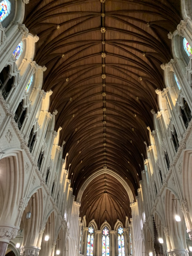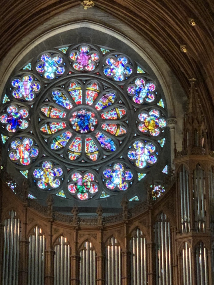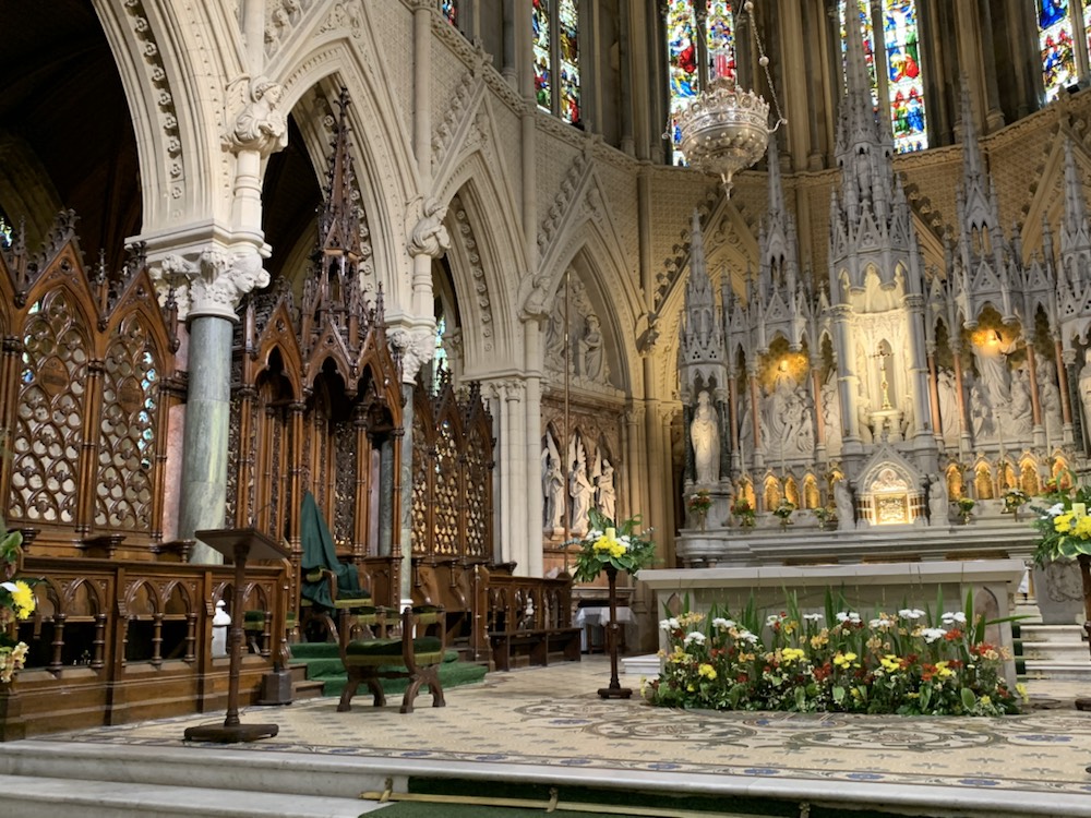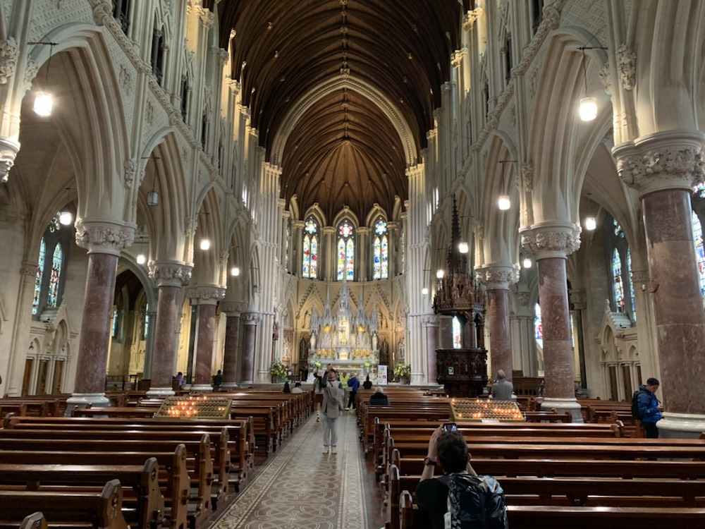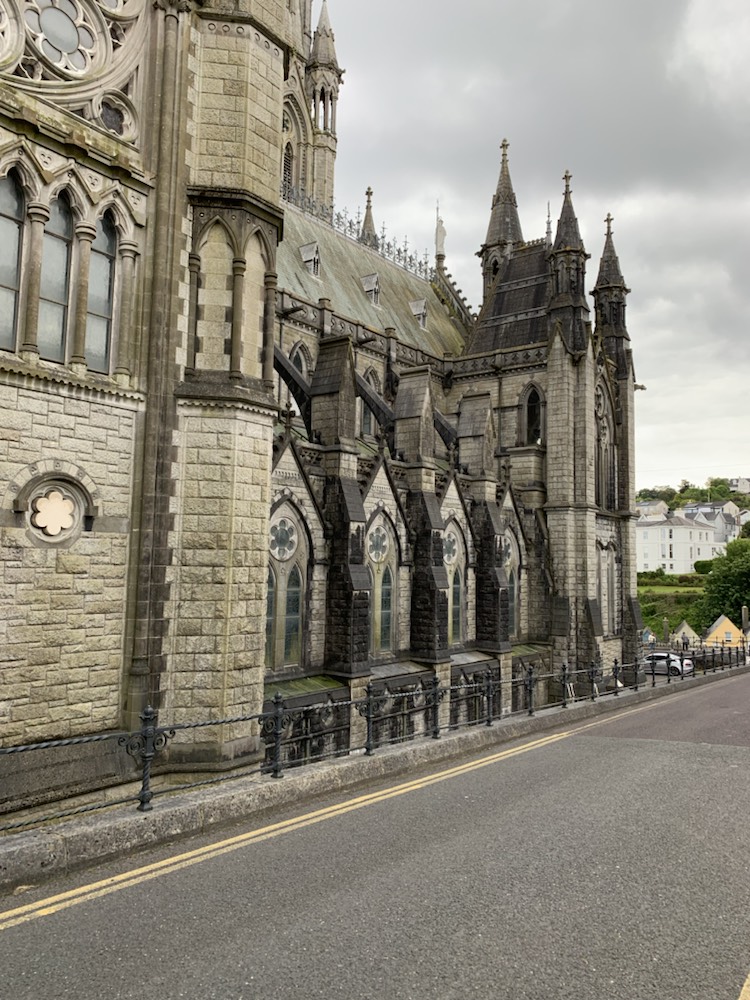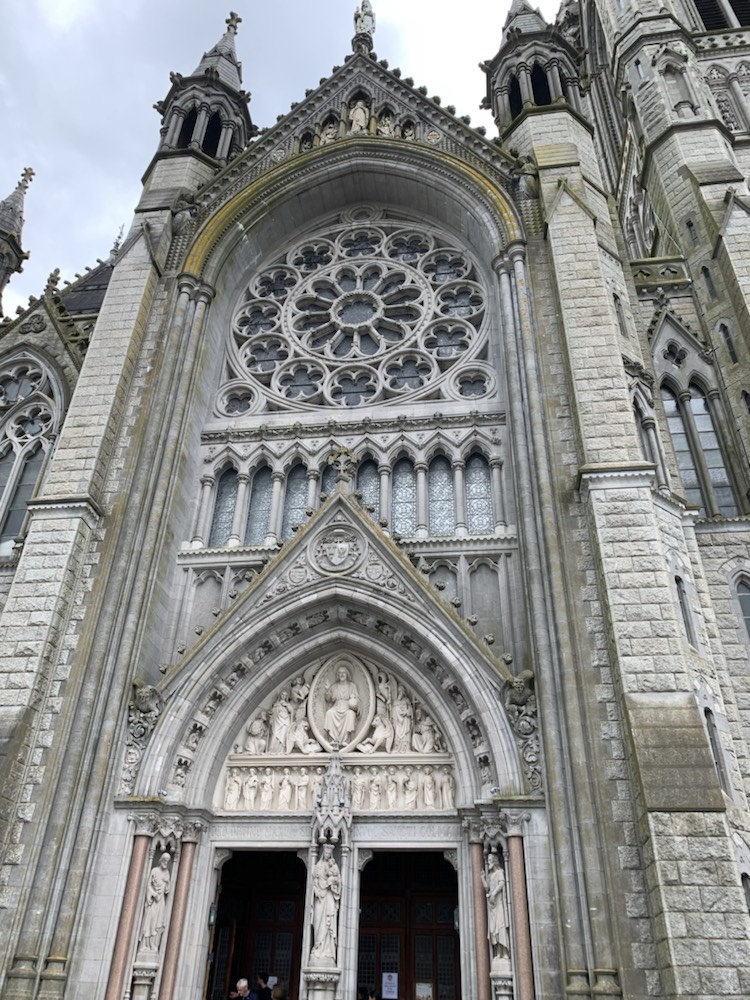 The 2+ hours spent there went by very quickly and once back on the coach, we were thankful to our guide who had suggested we make a direct line to the castle and climb it, if you want to, as the queues start forming and one’s entire visit can be taken up just queuing to kiss the stone. We then went tot Cork, for a brief city tour. There is a frequent train service between Cork and the port of Cobh, which Patsy and David took and were back for their afternoon tour. So back in Cobh, and after asking the guide for lunch -restaurants we had a nice meal and the critical Guinness at the Waterfront Restaurant (and Hotel) which was close to the Cruise terminal overlooking the river. The other alternative we were given as suggestion, which Patsy and David enjoyed, was the Kelly’s Pub although the Mauritania Pub near the memorial to all who lost their lives on the Lusitania (May 7, 1915), seemed more lively and lots of people enjoying a pint in the sun. . We then walked up the steep hill to the spectacular Cathedral that I previously mentioned. If you are ever in Cobh, this is a “Must See” place even though it is a long steep climb up the hill. The view over the harbour is terrific, but the Cathedral itself is remarkable. St. Coleman’s Cathedral is 210 feet (64 meters) in length and 120 feet (36.6 meters) in width built in Neo-Gothic Style at a cost of UK Pounds 235,000. The height of the spire is 300 Feet (91.5 meters) and was completed in 1915 with the Carillon Clock (largest in the UK and Ireland with 49 bells weighing 25,400 kilos, played from a console in the belfry) was installed in 1916. (www.cobhcathedralparish.ie). Of particular note is one of the side chapel is that of Thaddeus, next to Lady Chapel to the left of the main altar with Sacred Heart and Pieta chapels on the right. Thaddeus McCarthy (born 1455) was named bishop of the Diocese of Ross by Pope Sixtus IV. However when he arrived, the feuding rival family O’Driscolls had already been named bishop by the same Pope! Thaddeus returned to Rome to have him sort it out. He was named Bishop of Cork and Cloyne by Pope Innocent VIII. However when he arrived, the other feuding family – the FitzGeralds had taken the seat. They fabricated stories against Thaddeus and eventually he was excommunicated. He pleaded with his followers not to lead to violence. Eventually he was restored to the faith and status as a Bishop and returned to Ireland disguised as a pilgrim, but due to all his trials and tribulations, he died in a hostel near Lvrea, Italy at the age of 37. In the morning the monks found a mysterious glow coming from the body and room where he had died, and upon investigation, found him to be an Irish Bishop, not a pilgrim. He was laid to rest under the main altar with St. Eusebius in the local cathedral with all the rights of a bishop. Next to the Cathedral there is a chapel of Perpetual Adoration which is difficult to find, but we followed the signs and entered this small 10 seat chapel. It was built between 1868 and 1915, so even though relatively modern, it could quite easily have come from the Middle Ages or before. St Coleman (522 – 604) is the patron saint of the Diocese of Cloyne, with Cobh being part of that Diocese. His day of celebration is November 24th.