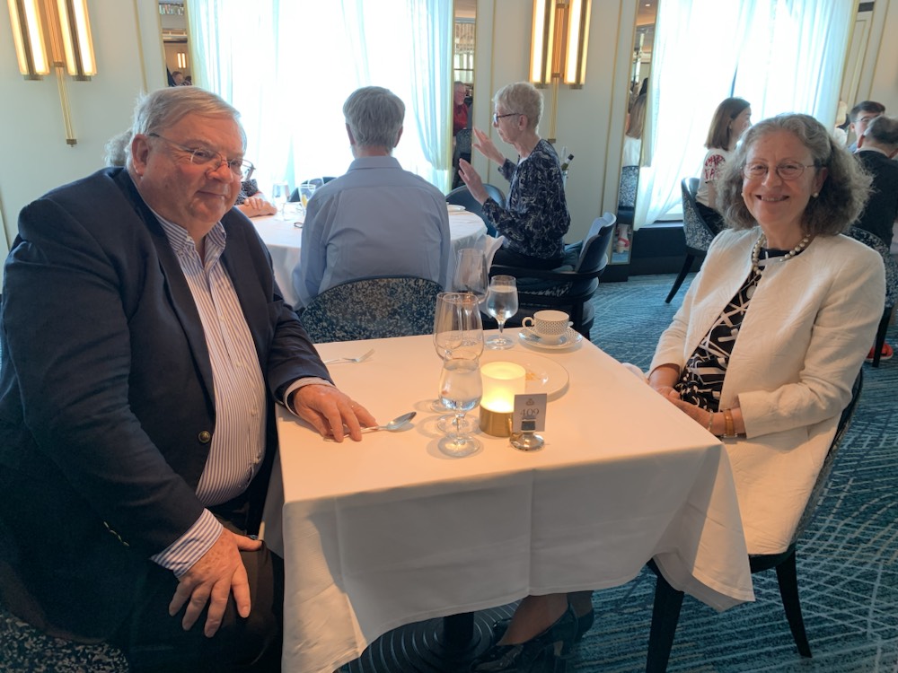 We awoke to the “Twin’s” birthday – Anne and my sister Diana were born on the same day, 3 hours apart in the same hospital in Mexico City, shall we leave it at “a few decades ago”!!!! However the routine was basically the same – the first lecture we attended was the BBC presenter and an exceptionally well known personality – Angela Rippon. During her 58 years in Broadcasting (she is 79) she has covered 7 Royal Weddings (including Price Charles & Lady Diana), 2 funerals (Prince Philip and Queen Elizabeth) and a coronation (King Charles), as well as many other events and documentaries, programs. She recounted some of the interesting activities and behind the scenes moments that span her career. The theatre was full, standing in the aisles as well as being simulcast in the Pub and in every stateroom given the interest.