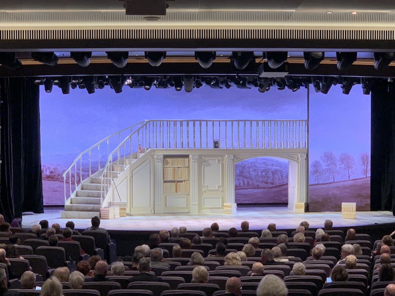 It being our Wedding Anniversary, and Sunday, we decided to have lunch at the Steak-house Sir Samuel’s. After a leisurely afternoon, we got dressed for dinner and then went to Pride and Prejudice (Sort Of) show. This was the third time it was on during this cruise. The first time it was put off due to illness of one of the five actors; the second time, the play-write had to substitute for a different ill actor, which we saw and was good and so tonight with the full cast, it was slow and at best average, with many people walking out of the theatre in drips and drabs, starting after about 30 minutes into the show. Sad, but it needs to be improved, if it is to last.