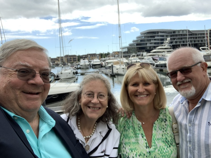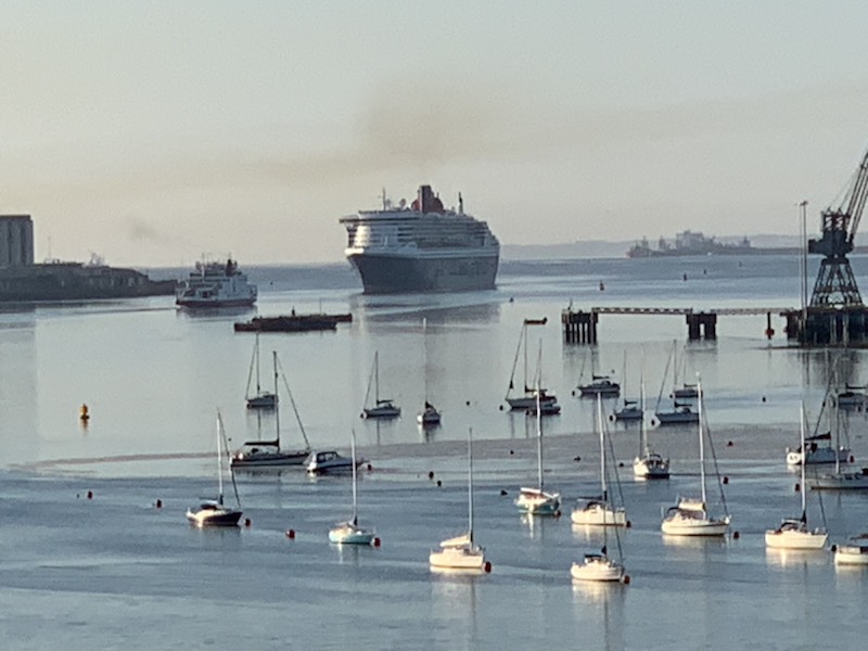 We were up early, did our final packing and were ready to disembark Queen Anne by 8:30 AM. However we were not allowed off even though we had been told as we and 95 others were going from one ship to another and could get off any time. Eventually we were able to get out, collect our luggage and found the coach that would take our luggage to queen Mary II. We chatted with the driver for a while and then eventually about 10:30 we and about 40 people were taken over to the Queen Elizabeth II terminal where the Queen Mary II was docked. Our luggage went automatically through the process and we next saw it in the new room on Queen Mary. We had been told that we could check in and take our hand luggage into our room then get off the ship and spend the day in Southampton. Well, after a bit of confusion at the QM2 terminal, we did check in, but no-one was allowed on the ship as guests were still getting off the ship. So with 6 pieces of hand luggage we contacted Suzanne and Neil Davidson, who kindly drove down to join us for lunch and they picked us up and off to a nice restaurant overlooking the marina, which was terrific. It was great to hear of their recent trip to the wilds of Africa, where they rented a “home on wheels” and went off into the wilds, with only the animals to keep them company. It sounded like a truly amazing trip.