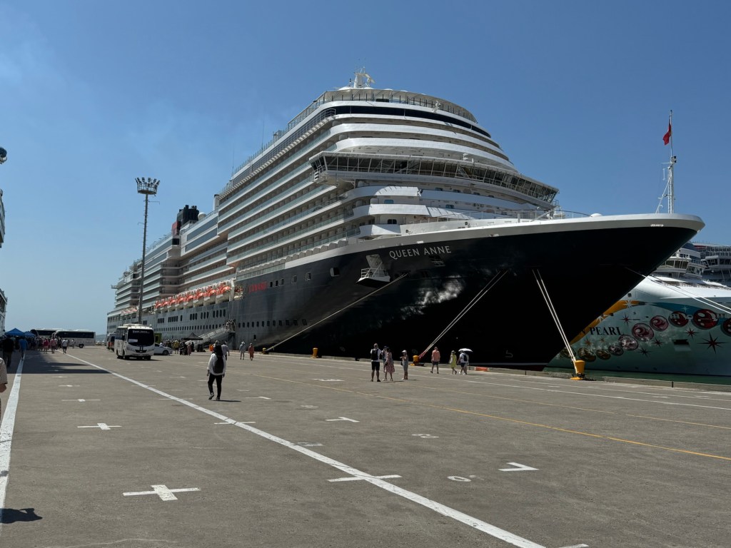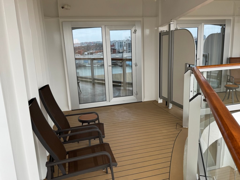 After traveling from Arlington VT yesterday, stopping at Fiesta Mexicana (the original Mañanitas as that was closed for a party), Diana and Nelson Clifford, Anne and Roger got to Red Hook Brooklyn to see the Queen Anne in New York for the first time ever. It had just crossed the Atlantic (apparently a very rough crossing) and was boarding the US based passengers for the Maiden World voyage of the Queen Anne. We had booked for the four of us on the first day the voyage was announced as we were on the Queen Mary 2 on a World Cruise a couple of years ago and Yo-yo (our booking agent aboard) was able to get us two cabins with double sized balconies one on each side of the ship. The Cliffords are in 8117 and we are in 8130.