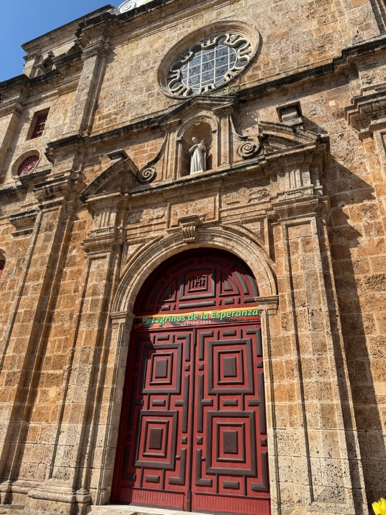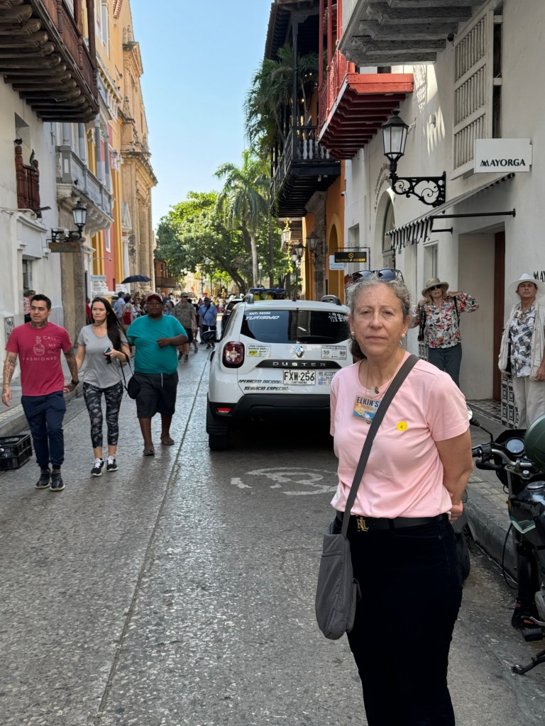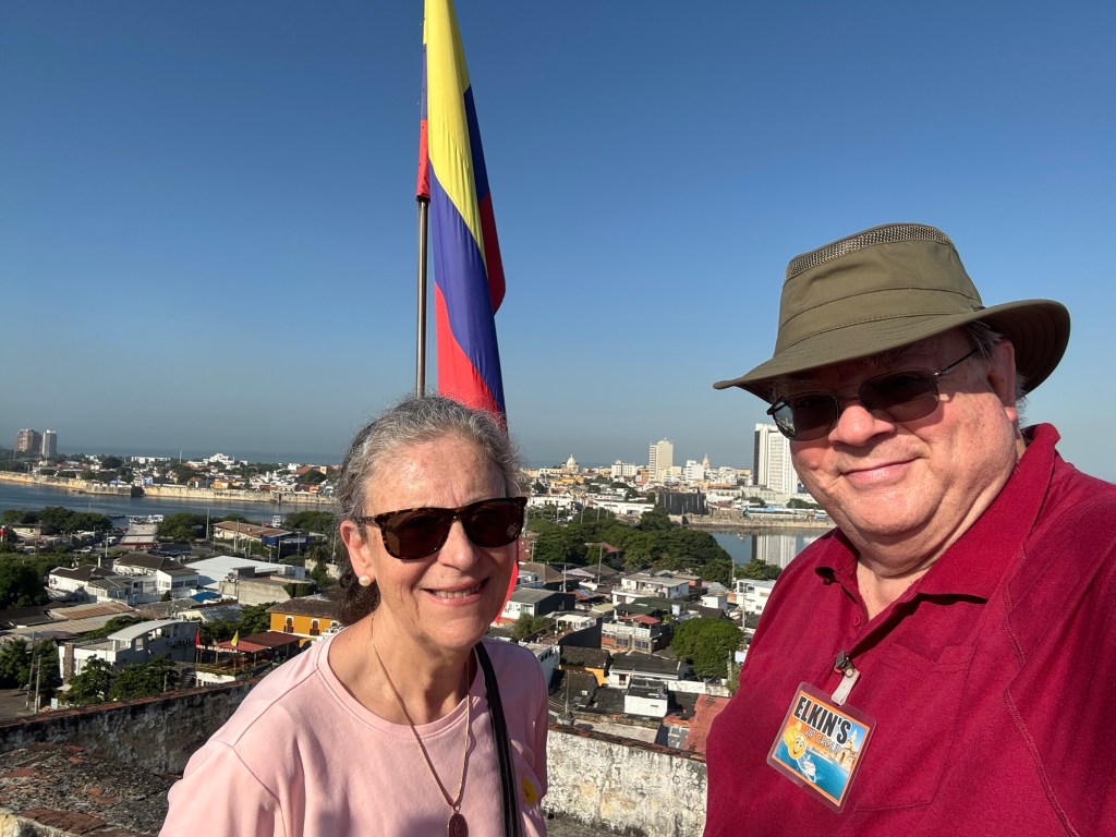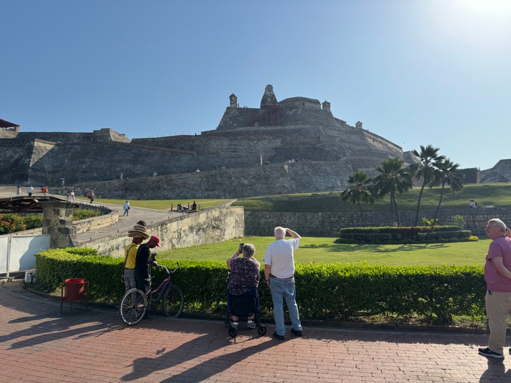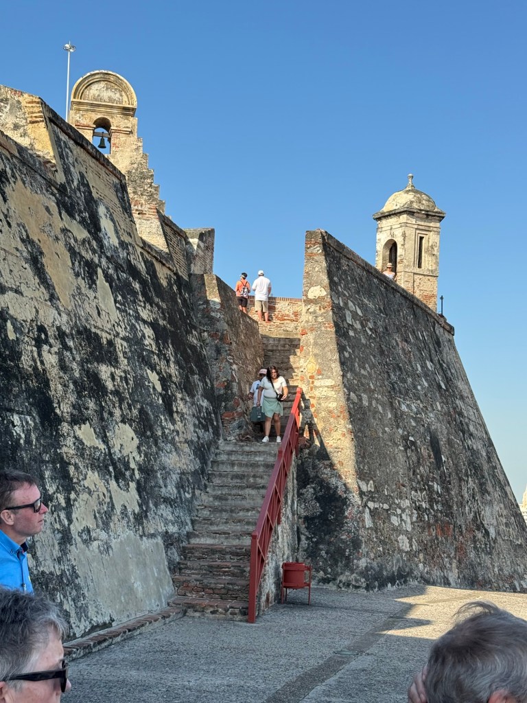 We were on a tour “Cartagena by Land and Sea”, Coach 4 with Arturo as the driver and Elkin as the guide. Once on the coach which was next to the ship, with the Norwegian Joy, next to the Queen Anne. It was completely booked up, as were all the tours. We headed out directly to the old Spanish fort or castle of San Felipe de Barajas. It was supposedly the largest fort that was ever built by the Spaniards in the Americas. The reason for the importance of the City was that all the Gold from Peru and the other neighboring countries was brought to Cartagena to ship to Spain. The Fort has various ramps making their way up to the top with cannons facing up to the sky embedded in the construction. They were used to haul all the needed supplies up each of the ramps. From the top of the fort, there was a great view over the harbour as well as the old town and the new town with its skyscrapers.