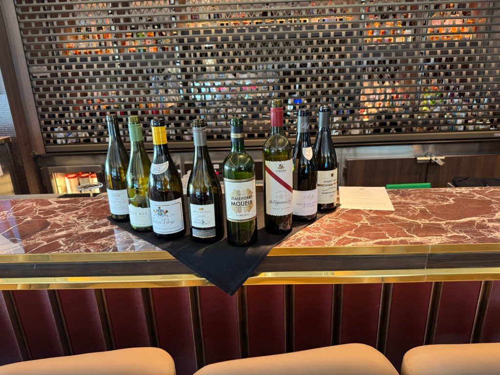 We had booked the “Lunch and Learn” in Sir Samuel’s (the steak house) but as the Cliffords and Coopers had booked ours separately, they sat us at tables at opposite ends of the restaurant. Katia was able to arrange that the four of us sit together in the Ají Wa restaurant next door, where we could hear very clearly yet have no-one around except for all the “wine action” which was taking place. Here, the wine being poured and trays filled. We calculated that Nikolai and his assistants served about 560 (8 wines for 70 people), so we were happy to be in our “private place” and enjoyed chatting with the sommeliers.