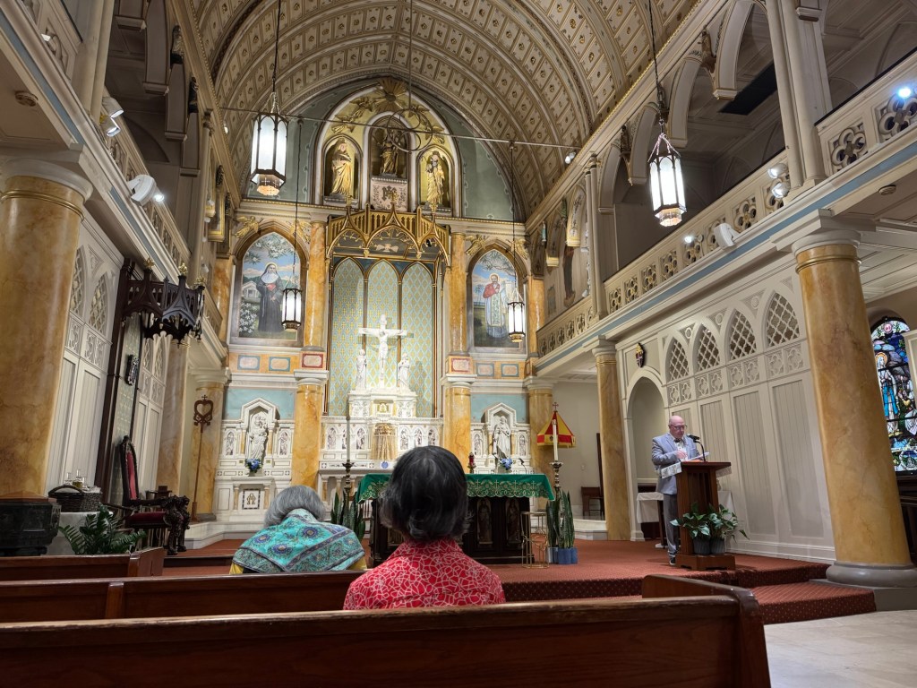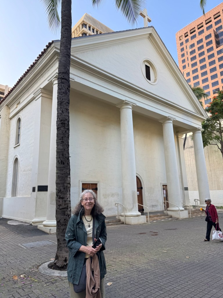 We docked, Starboard to Quay at Pier 2 in Honolulu at 8AM on the Island of Oahu (The Gathering Place, 112 Miles of coastline) in the Chain of 8 islands (Ni’ihau, Kaua’i, O’ahu, Moloka’i, Lana’i, Maui, Kaho’olawe and “The Big Island” called Hawai’i) known as the USA State of Hawaii. We soon disembarked and walked the 20 minutes to the downtown area and specifically to the Roman Catholic Cathedral Basilica of our Lady of Peace. Located at 1184 Bishop Street, Honolulu, HI 96813; Phone +1 (808) 536-7036; http://www.honolululcathederal.org; Email – coolop@rcchawaii.org. The Sunday services are 6 AM, 8 AM, 10AM, Noon and 6PM. Anne arrived at the church during the 8 AM service and the cathedral was packed. We went to the 10AM service and it was also completely full including on the second level. So it seems like it is extremely active. We stood out from among the locals and were greeted warmly and given a Lei made of small shells. A very nice touch. It was interesting that the two saints in the reredos are Saint Marianne and Saint Damien. The connection is that St. Damien worked on Moloka’i island helping the Leper colony there. Brother Dutton, who is in the process of becoming a saint, was St. Damien’s assistant. The church that Anne attends when we are in Stowe VT, Blessed Sacrament Church, is related to the Dutton family. The property belonged to the Dutton family and was donated by Brother Dutton’s family to the Catholic Church. The outside of the church is decorated with burned wood carvings of the story of Brother Dutton going to work with St. Damien.