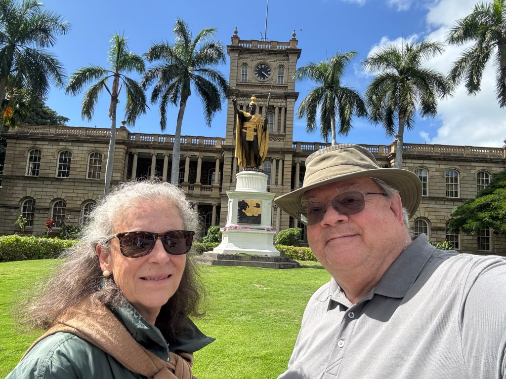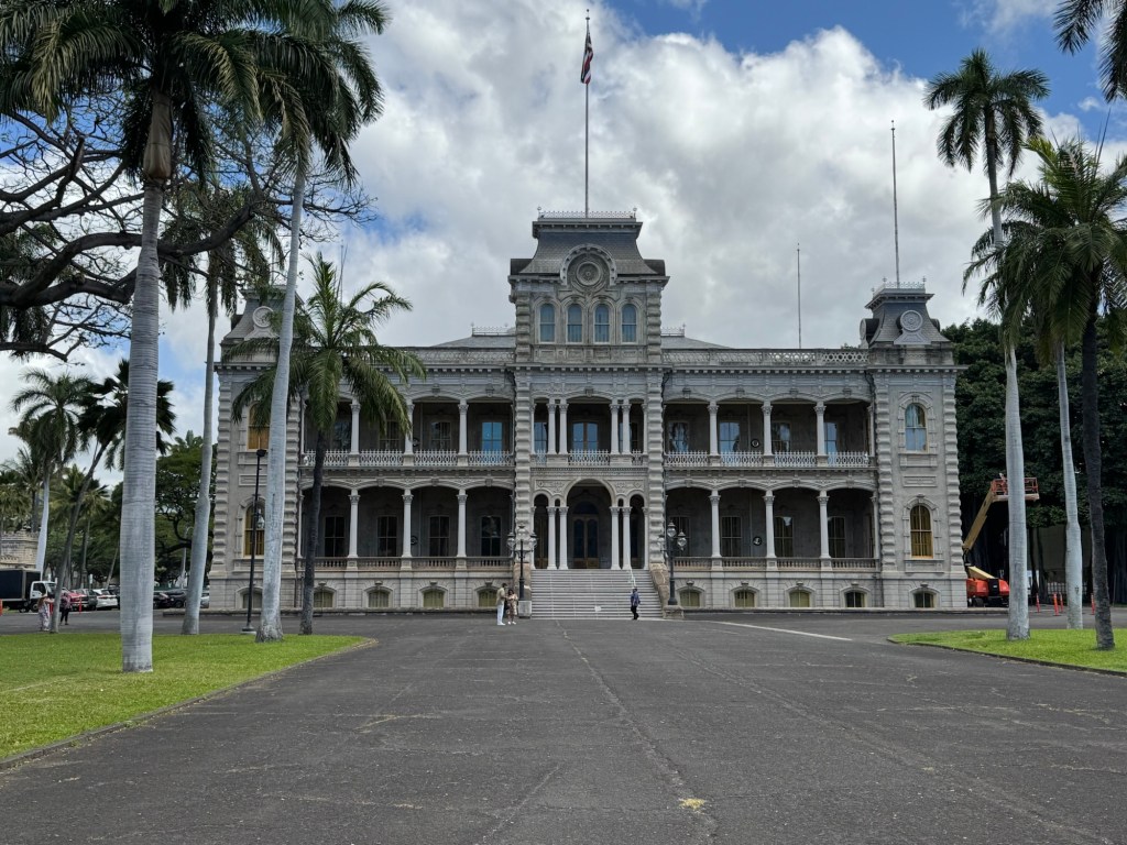 We then wandered back to the ship but not before going down a pedestrian Fort street mall, filled with closed stores. It is the beginning of the Chinatown area which we found out later, suffered greatly during COVID epidemic and most of the shops and businesses are now closed. So we took King Street and ended up at the Iolani Palace (completed in 1882), the residence of the Kings of Hawaii, its last monarch Queen Lili’uokcalani in 1893. It is the only Royal Palace in any US State. We then saw the statue erected in 1883 of King Kamehameha I (who united the islands in 1810) in front of the Ali’iōlani Hale (Hawaii State Supreme Court and Judiciary building), past City Hall and all the government buildings, The Kawaiaha’o Church (known as the “Westminster Abby of the Pacific”, built in 1842, using coral blocks as the first Christian Church) before heading down Punchbowl Street (so called as it leads to the Punchbowl (crater) Cemetery or it’s official name is the National Memorial Cemetery of the Pacific) back to the Pier 2 and Queen Anne.