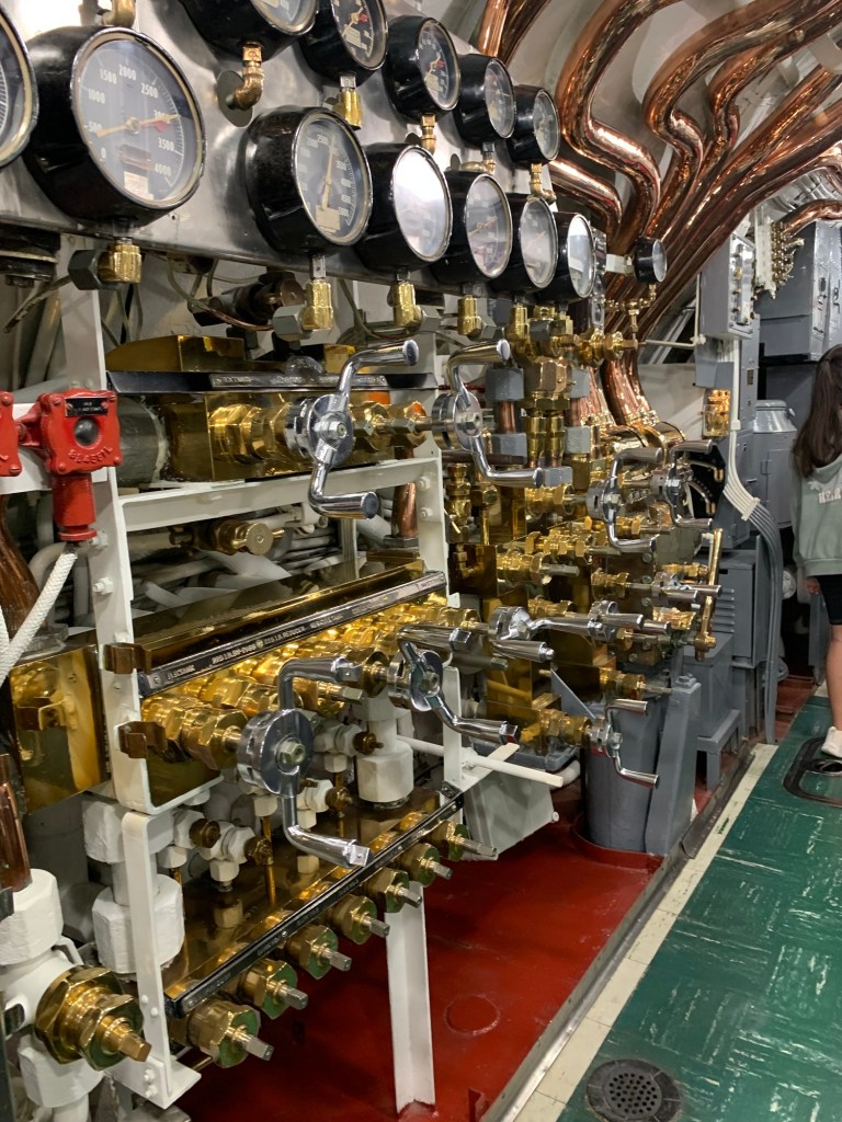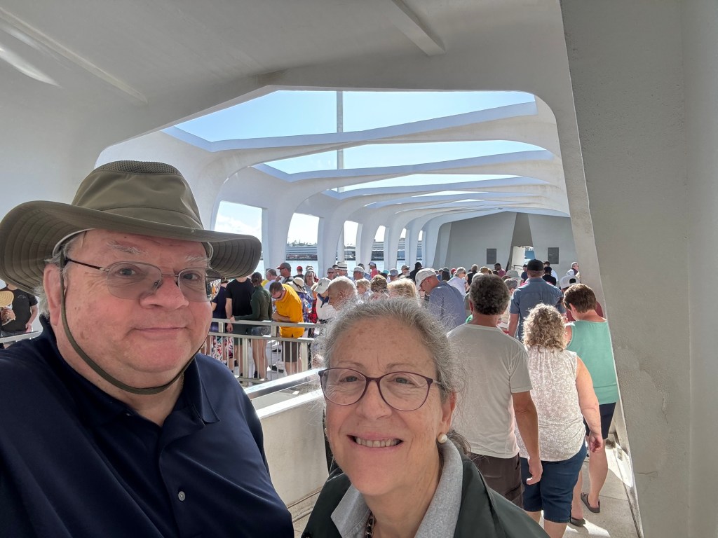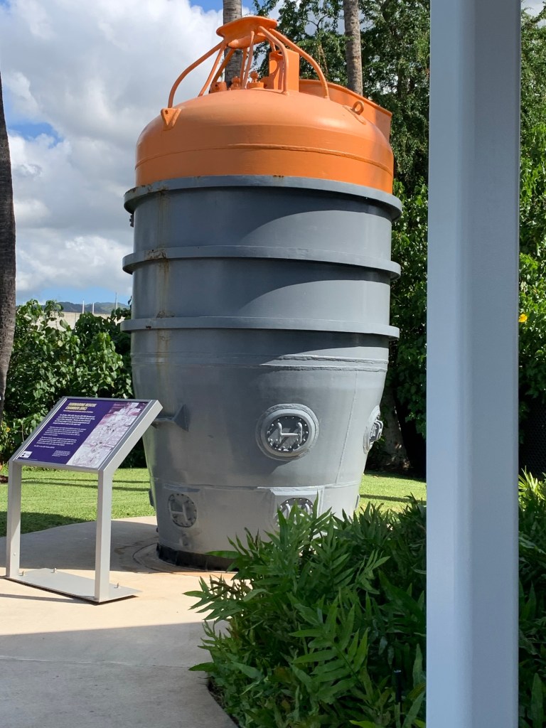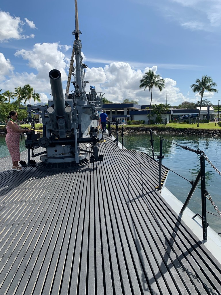 The entrance and visit to the USS Arizona is free, but access to the other ships etc has a cost and a per site or all day pass can be purchased. If you have an interest in the entire story, it certainly is well worth a full day visit. A small snack bar is available, but Anne, bravely visited the Bowfin submarine that is one of the other ships in the area. At the entrance of the submarine there is a cafe where one can order burgers and hot sandwich type meals and an open air, covered seating area where there is a nice breeze and a great place to go for nutrition during the day. I say “brave” as anyone who is in the slightest claustrophobic, should definitely not attempt to visit the Bowfin. Anne’s pictures demonstrate the close quarters that are the submarine and the home of 60 sailors. Triple bunk beds are in constant use with each sailor resting for 8 hours then on duty for 16 while two others used the same bunk each having it for 8 hours at a time. Only the cooks were permitted to take daily showers. Toilets were cramped and even the Captain who had a single bed and desk was cramped, senior officers had 2 bunk beds to a room, others 6 to a room and the “men” 16 to a room. Winding passage ways with a myriad of weapons, cables gauges etc filled the restricted space.