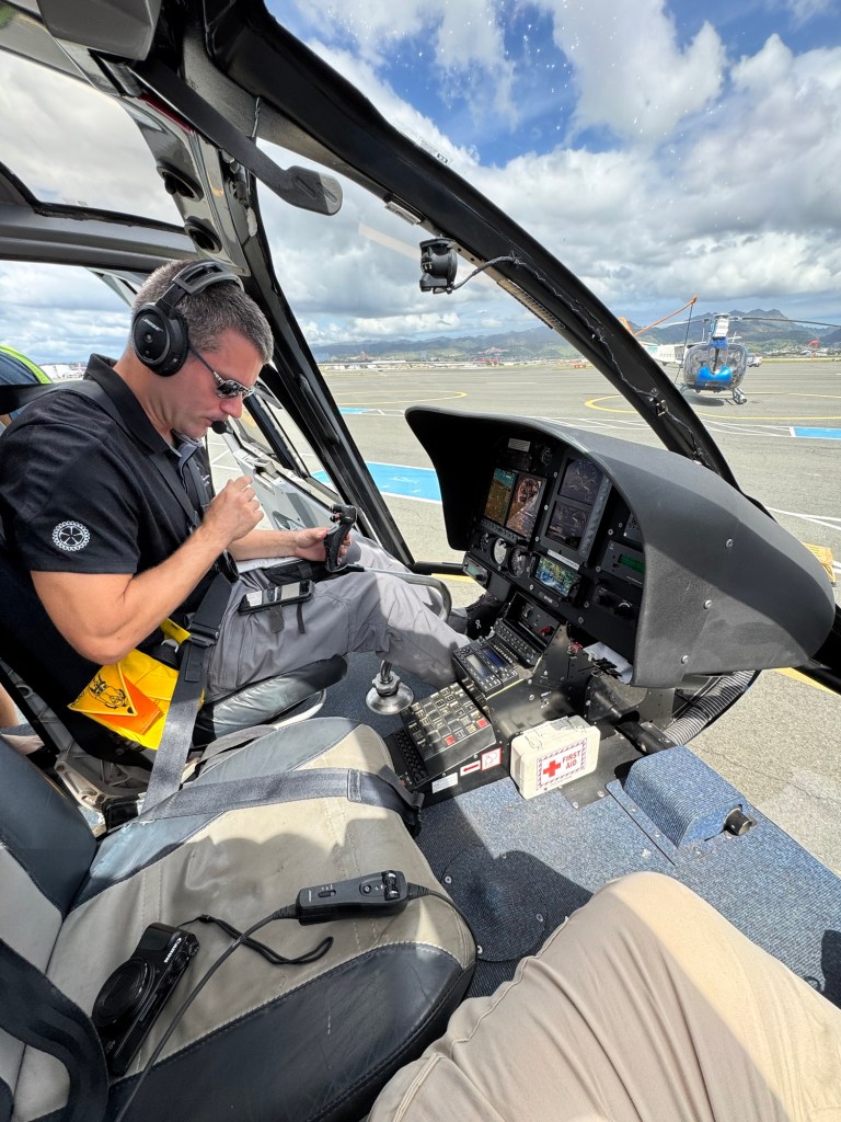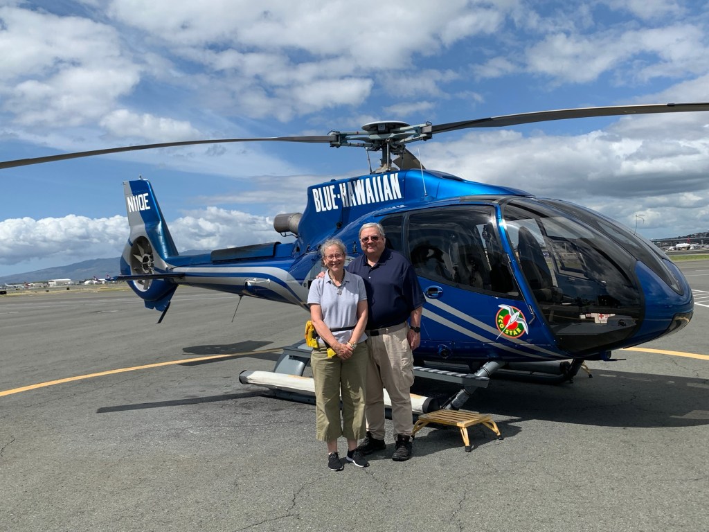 It was time to go to the next activity which we had booked yesterday, even though there was a great deal more to see at Pearl Harbor. So we got another Taxi driver from Vietnam (Rich Hoang – Phone +1 (808) 200-6640 in a 7 passenger Honda Odyssey), who was also good, but complained at having a relatively short run. Pearl Harbor, the International Airport and the Heliport are all relatively close by on the Eastern side of Honolulu. We arrived at the Blue Hawaiian Helicopter (99 Kaulele Place, Honolulu, HI 96819; Phone +1 (808) 275-4531; Web http://www.bluehawaiian.com; E-mail – info@bluehawaiian.com) departure office, a good hour before our scheduled departure time of 2PM. We got weighed and checked in and were told that the other three passengers and our pilot Chris, were all there so we could leave early. We met up with a mother and two daughters, originally from Czech Republic but now living in Vancouver, Canada and proceeded with the pre-flight educational / safety briefing. The husband was there but did not want to fly so we were in total 5 passengers and the pilot, but there was room for 6 passengers. There is a weight restriction, so it is best to check with the reservation people before making the final reservation. We walked out to one of the two helicopters that they own and fly and were escorted into our seats, harnessed into the seat restraint and given earphones and a microphone as there was quite a lot of noise. The entire flight was recorded as there were several cameras both inside and outside the helicopter – we purchased the USB Thumb drive at the completion of the flight. We were now ready to have the experience of our lifetimes. It is expensive, but truly well worth the experience of the 1 hour flight. We felt comfortable with the pilot who is one of 5 full time and several part time pilots that do 3 from a maximum of 7 flights a day, depending on the season and the demand. They have been in business for several decades and at least for the past 30 years there has not been a serious incident as they are inspected by the authorities, have their own mechanics and support staff, so we felt very comforted that all will be well.