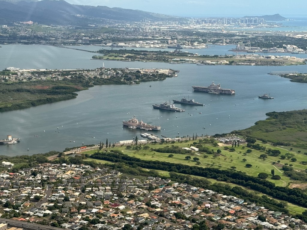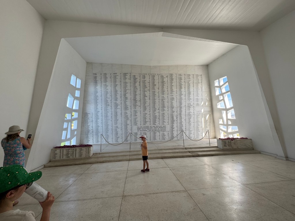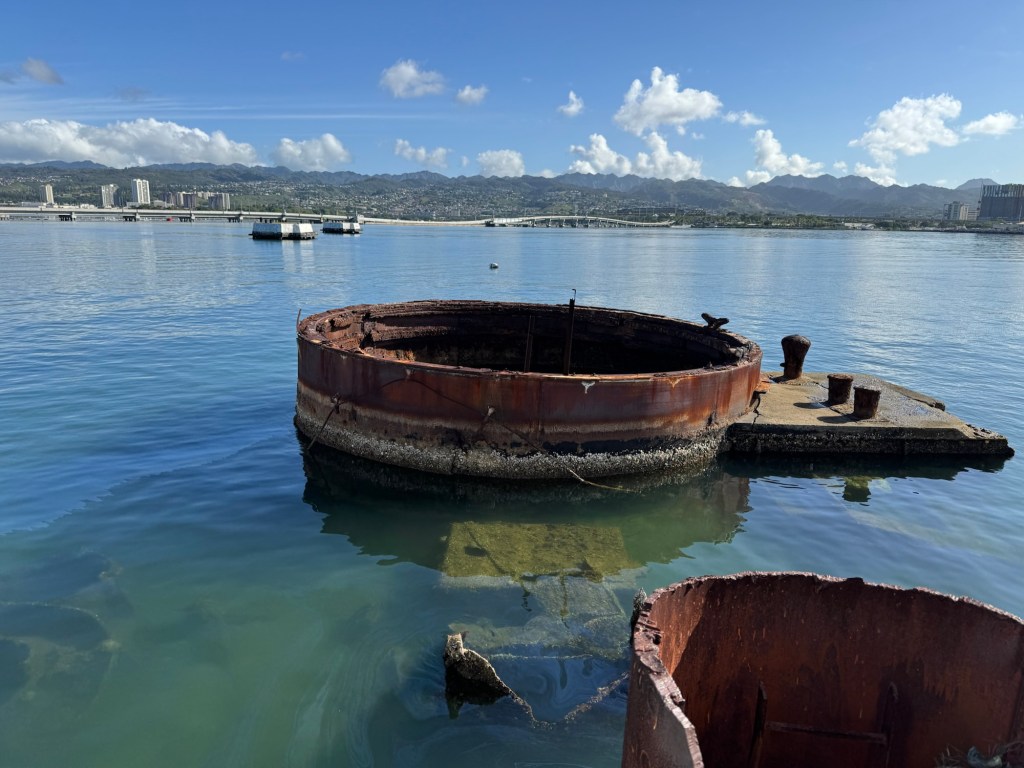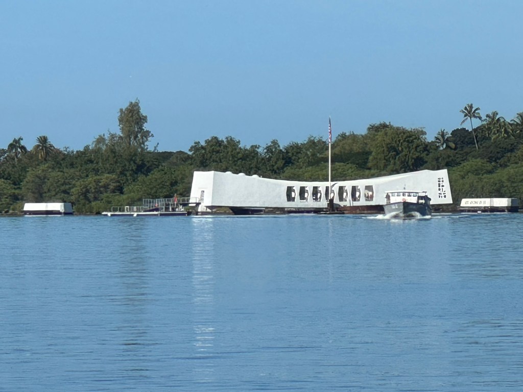Phu (Phil) the taxi driver picked us up as planned and drove us to the Pearl Harbour Military site (Pearl Harbor National – 1 Arizona Memorial Place, Honolulu, HI 96818; Phone +1 (808) 422-3300; http://www.nps.gov/perl) Memorial where there is very well laid out history of the Pearl Harbour “Day that will live in Infamy” as the US president said at the time. Usually you have to book prior to 3PM the prior day (www.recreation.gov), to go to see the USS Arizona Memorial, however, we were very lucky and arrived, went to the Standby area and put in phone, name etc and were told – go over to the building where the boat leaves from as there is a 100% chance that you will get through. We did as instructed and by the time we got to the building we had received the second email (the first just confirmed that we had made the standby application) stating that you have 5 minutes to check in or loose the booking. So we got into the queue to see the Memorial. We were shown on the boat (capacity of about 100) and off across the harbor to the USS Arizona Memorial. On that fateful Sunday December 7th, 1941, there were 185 Naval Vessels in the Harbour when the Japanese planes in the first wave flew over Ford Island striking the USS West Virginia, Oklahoma, California and Nevada and tore through the Arizona. We asked why pick out the place where the USS Arizona and not the others that were sunk? The answer was that there were more people killed on the Arizona (1,177) than elsewhere. In total 2,390 people were killed (1,999 sailors, 233 soldiers and airmen, 109 marines and 49 civilians and 21 ships were sunk or heavily damages with only three – the USS Arizona, USS Oklahoma and USS Utah were never returned to service). There were a total of 1,178 wounded. The Arizona Memorial is there to honor all who were killed and constructed over the top of the remains of the ship. Also because the expectation was that any attack would come by sea, the coasts were well fortified, but the aircraft were all bunched together in the center of the runway, making it easy for the Japanese to destroy 164 aircraft and damaged 159 more.