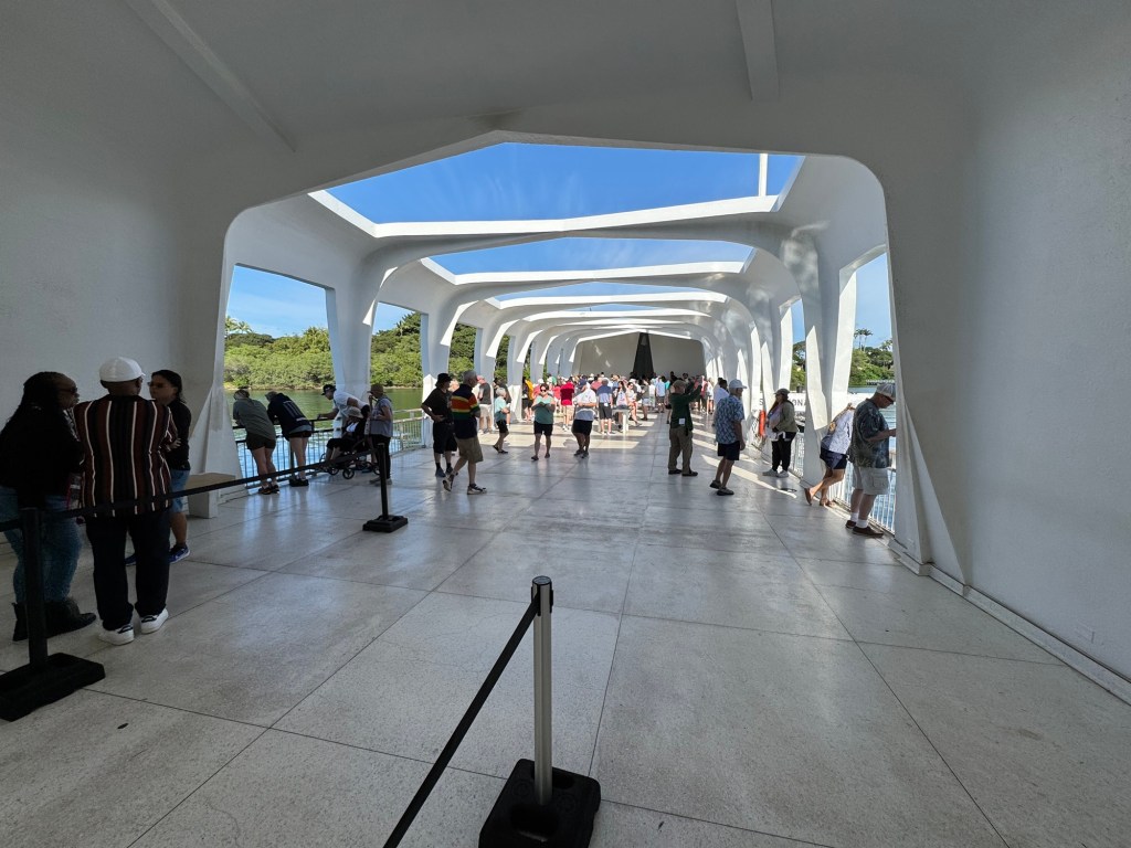 The small ship took us out to the Memorial, which is actually considered a cemetery as 900 of the dead were never recovered and all the others who died on the day can and are buried underneath the memorial. The boat drops you at one end of this open white steel structure that is 184 feet long, 36 feet wide and 21 feet high at the ends and 27 feet wide and 14 feet high in the center. The main part of the memorial is just an open space with open “windows” on both sides a couple of plaques on the walls and a hole in the far end where you can see wreckage of the original vessel at right angles to the Memorial. The most sacred place is the far end (from the access point and closest to shore) where a wall has the names of each person killed. A couple of side panels have been added with names of others who might have been there on the day, but survived and after their death, were placed in the bottom and their names added. There are some places for more, if needed. After about 20 minutes at the site, we were then taken back to the central area by a similar ship, which was bringing the next wave of visitors. All were quiet and had hushed voices as it is considered a grave site and respect for the dead was important to be maintained.