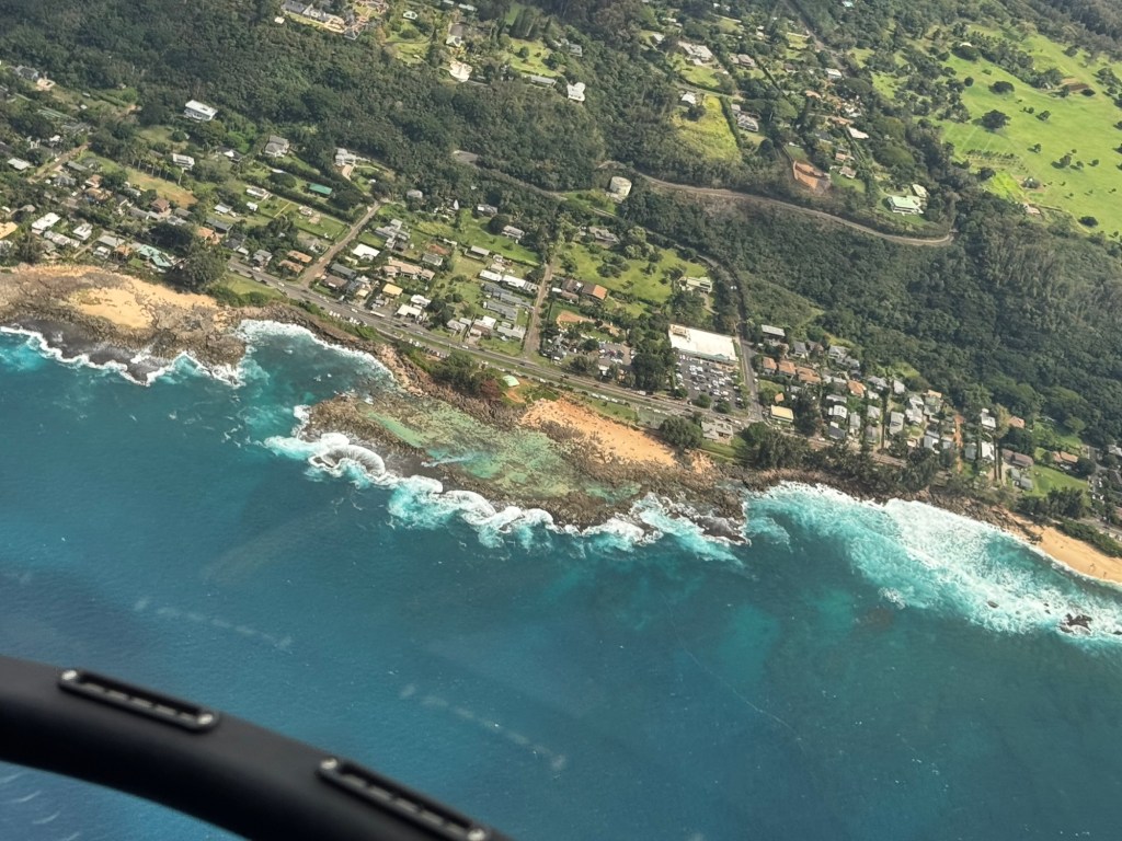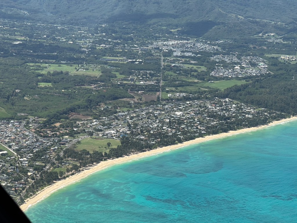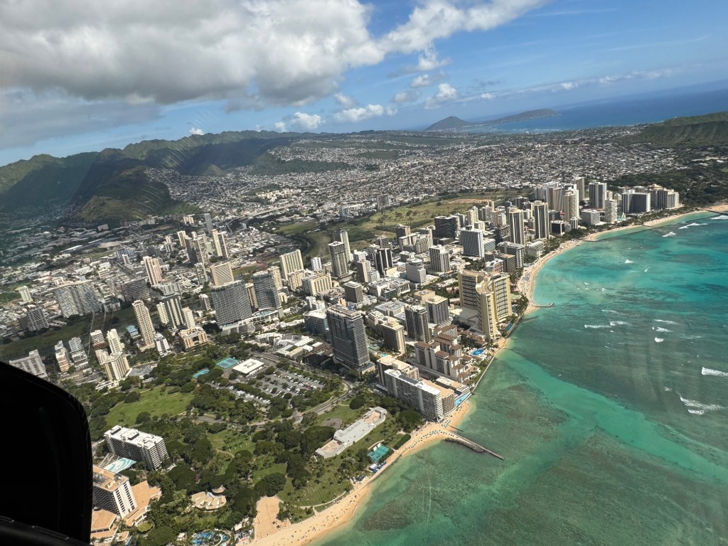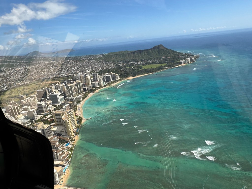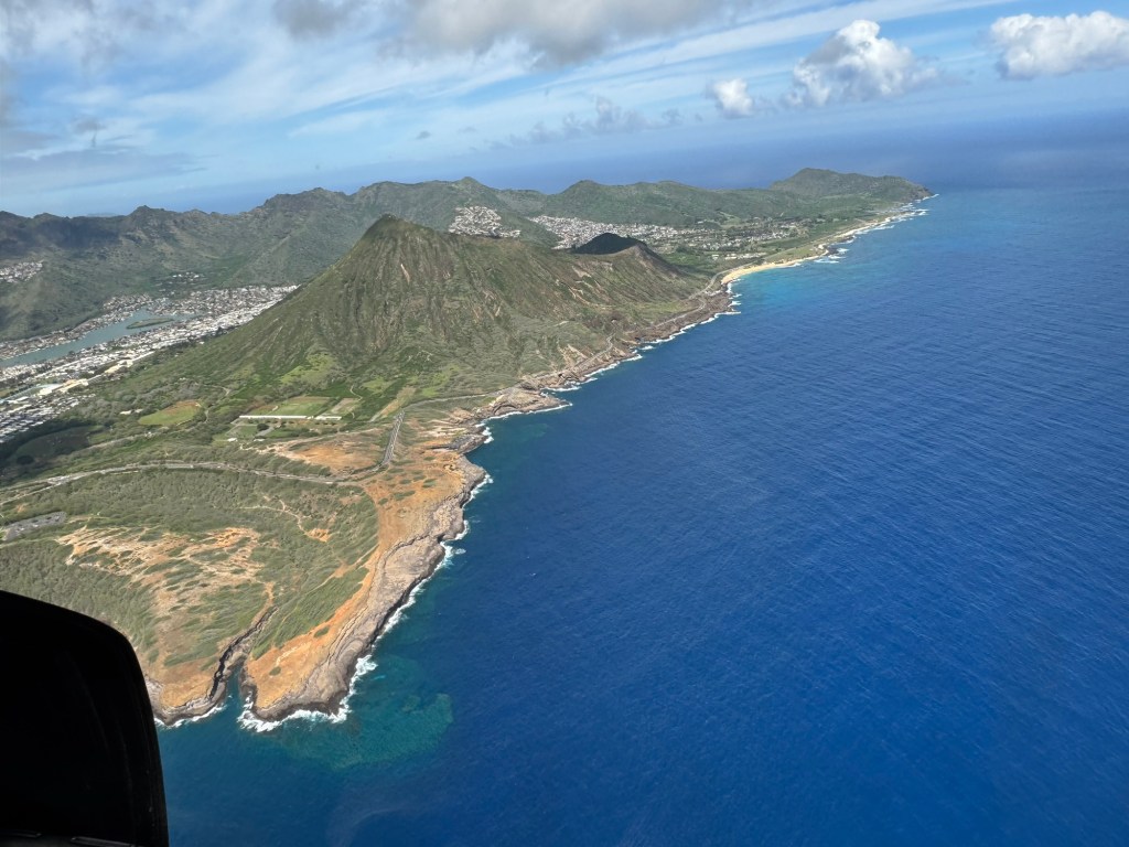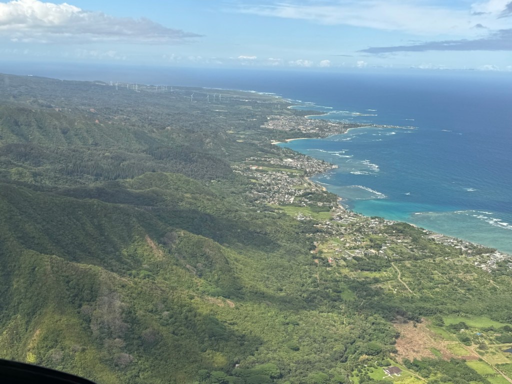 We took off heading West over the ocean past downtown Honolulu, with a great view and picture of our ship docked at Pier 2, then over to Waikiki beach area where Chris did a full 360 degree turn so all could see and take pictures and from the air we were able to see a whale coming out of the ocean and splashing down some yards further on. I believe it is called breaching and was indeed very spectacular. We then proceeded to circumnavigate the island continuing over Diamond head / point volcano / crater where you got a great view over the now extinct volcanos. We cut across at Sandy Beach cutting off Makapu’u point as it sometimes gets a bit rough there. Turning North we followed along the mountain range to our left and the sea to our right over the ground passing Waimanalo, Kailua, Kane’ohe, Kahalu’u seeing the housing, golf courses, surged coastline but gorgeous beaches and what was particularly fun was to see over the top of the many volcanoes seeing Honolulu on the other side of the island. At one point Chris pointed out a spectacular 2 step waterfall in a sort of crevice in the volcanoes which was also spectacular and can only be seen from a helicopter due to the lush thick vegetation surrounding it. He did a full 360 degree turn to be able to see it from all angles. We proceeded to Hau’ula and the Northern tip at Kahuku with the Turtle Bay Resort and Golf Course. Coming around the end of the volcanic range we flew along the beautiful beaches and landscape towards Hale’iwa., Mokule’ia, and Waialua where there was a vast farm of solar panels, many wind turbines / wind “farm” for producing electricity and the observatory. Turning inland on the other side of the volcano range we flew over the enormous Dole pineapple farm. It is unmistakable as there is a very large pineapple in the center of the world’s largest hedge maze and a lot of buildings with what seemed like endless acres of pineapple production. A must visit next time. At this point we were heading South over Wahiawa and Mililani and over Pearl City, and Pearl Harbour flying over where we spent the morning so we were able to see from above all we had seen from the ground in the morning which was amazing. Then past the Honolulu International Airport and back to the Blue Hawaiian terminal. An absolutely breathtaking and spectacular experience.