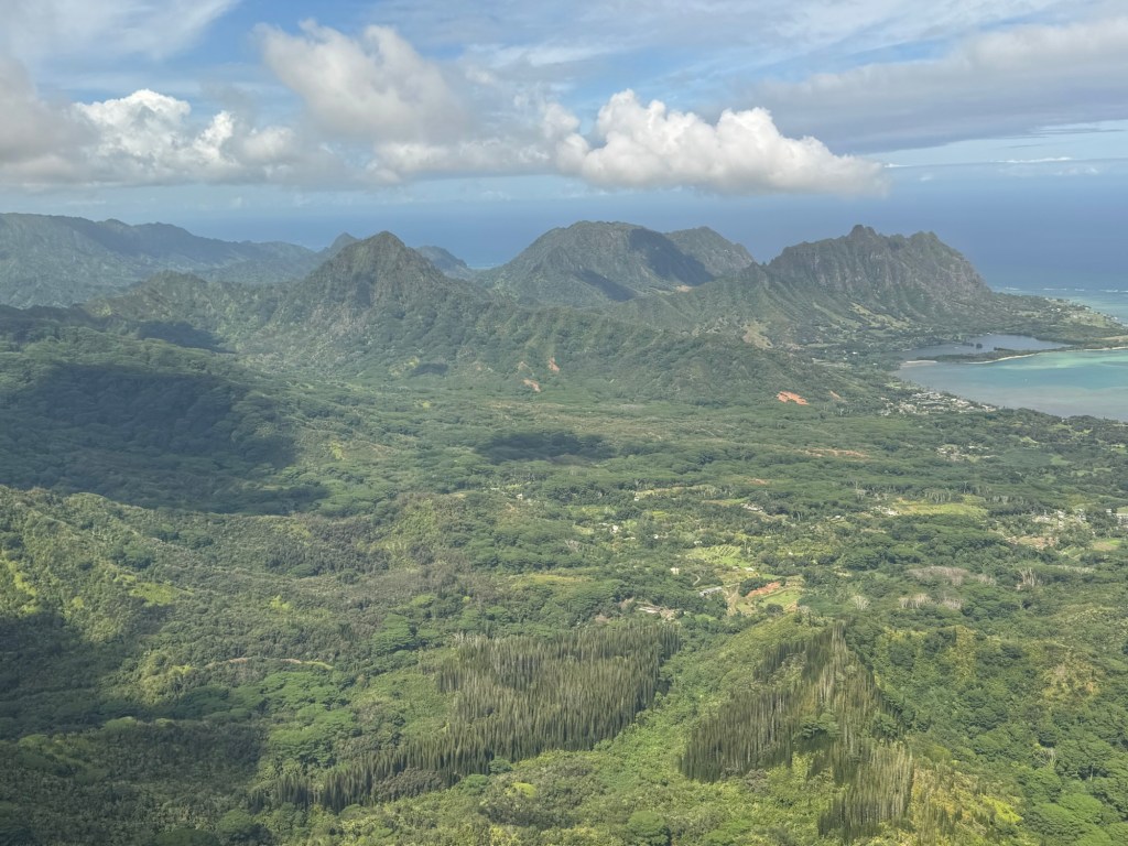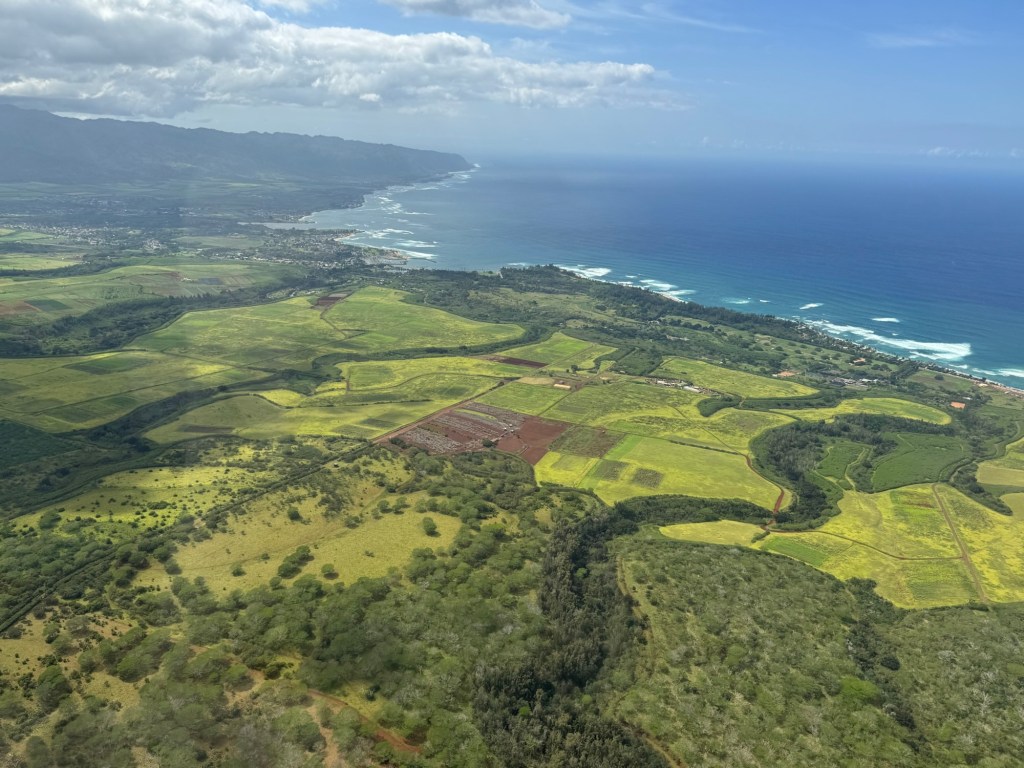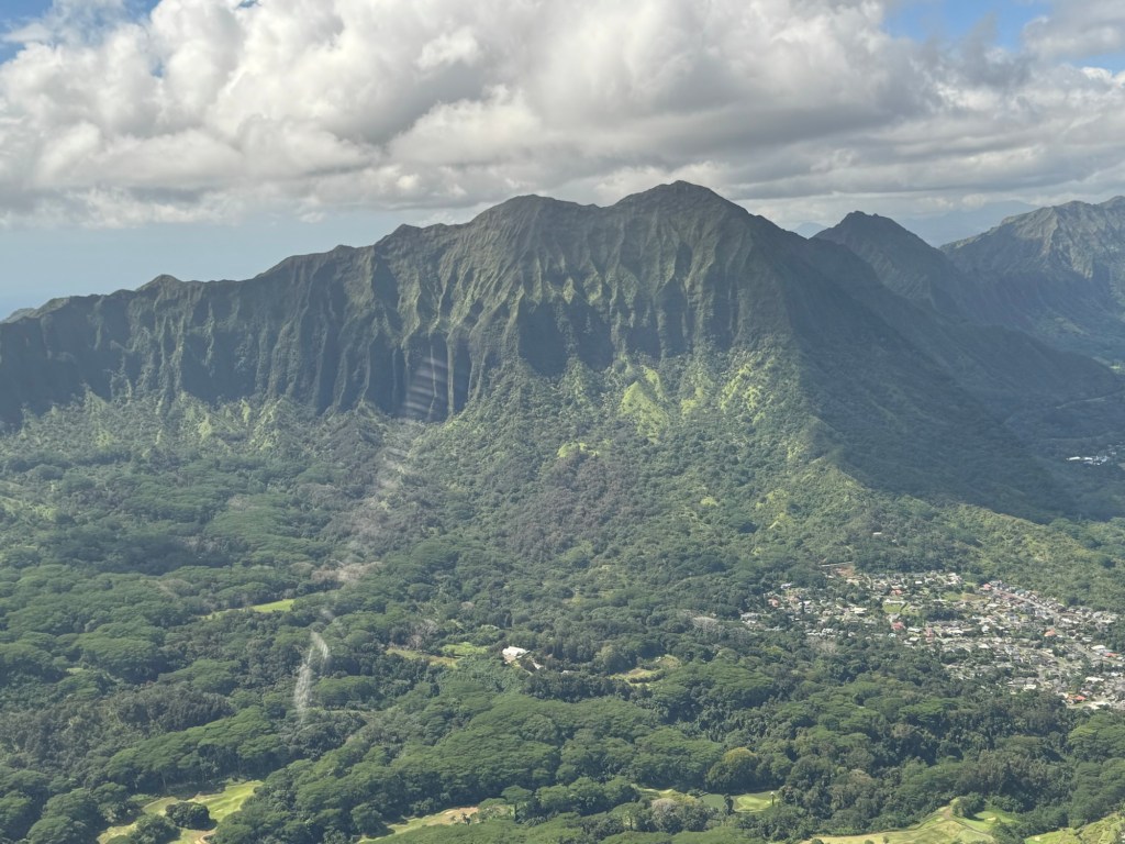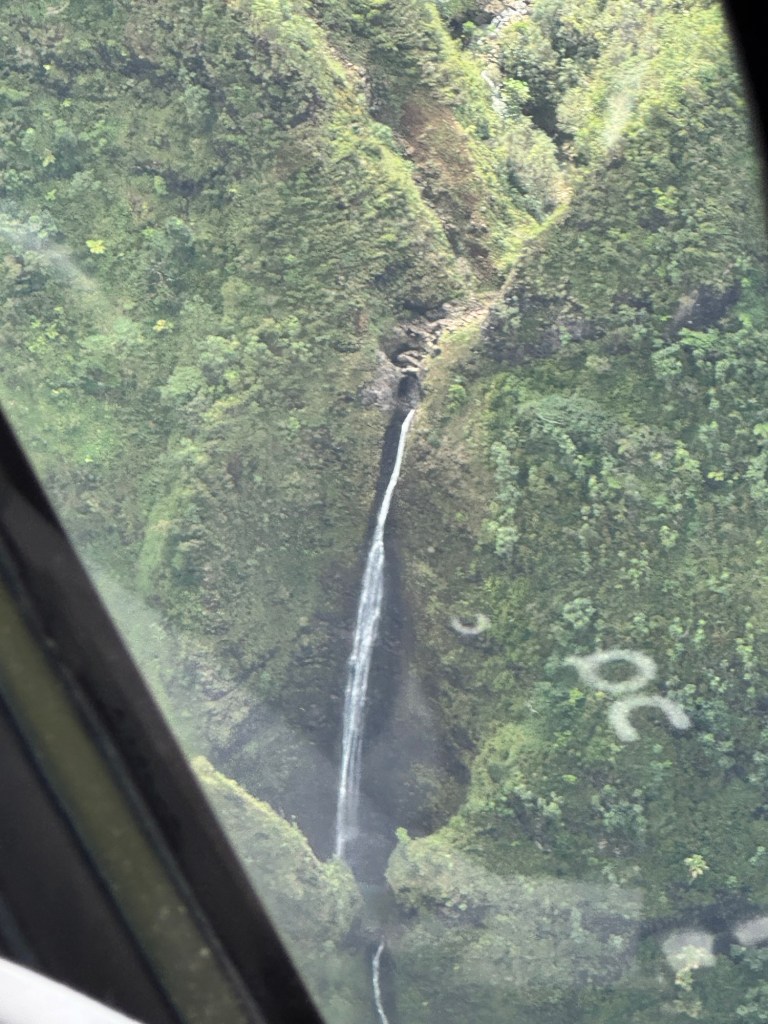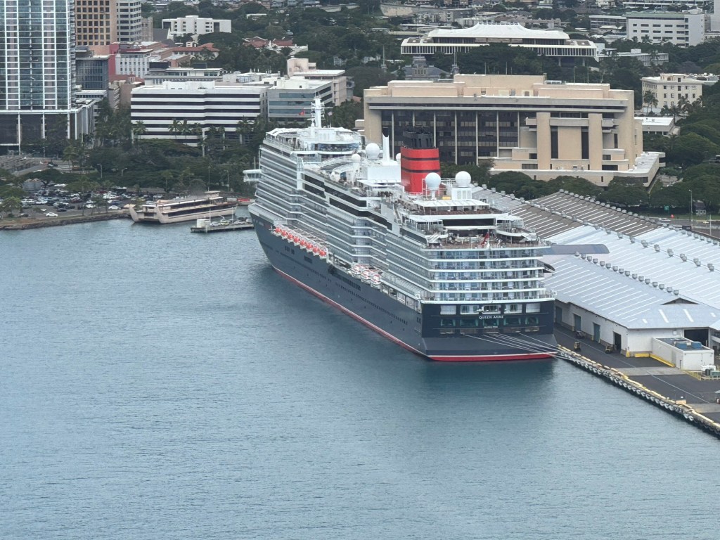 We took off heading West over the ocean past downtown Honolulu, with a great view and picture of our ship docked at Pier 2, then over to Waikiki beach area where Chris did a full 360 degree turn so all could see and take pictures and from the air we were able to see a whale coming out of the ocean and splashing down some yards further on. I believe it is called breaching and was indeed very spectacular. We then proceeded to circumnavigate the island continuing over Diamond head / point volcano / crater where you got a great view over the now extinct volcanos. We cut across at Sandy Beach cutting off Makapu’u point as it sometimes gets a bit rough there. Turning North we followed along the mountain range to our left and the sea to our right over the ground passing Waimanalo, Kailua, Kane’ohe, Kahalu’u seeing the housing, golf courses, surged coastline but gorgeous beaches and what was particularly fun was to see over the top of the many volcanoes seeing Honolulu on the other side of the island. At one point Chris pointed out a spectacular 2 step waterfall in a sort of crevice in the volcanoes which was also spectacular and can only be seen from a helicopter due to the lush thick vegetation surrounding it. He did a full 360 degree turn to be able to see it from all angles. We proceeded to Hau’ula and the Northern tip at Kahuku with the Turtle Bay Resort and Golf Course. Coming around the end of the volcanic range we flew along the beautiful beaches and landscape towards Hale’iwa., Mokule’ia, and Waialua where there was a vast farm of solar panels, many wind turbines / wind “farm” for producing electricity and the observatory. Turning inland on the other side of the volcano range we flew over the enormous Dole pineapple farm. It is unmistakable as there is a very large pineapple in the center of the world’s largest hedge maze and a lot of buildings with what seemed like endless acres of pineapple production. A must visit next time. At this point we were heading South over Wahiawa and Mililani and over Pearl City, and Pearl Harbour flying over where we spent the morning so we were able to see from above all we had seen from the ground in the morning which was amazing. Then past the Honolulu International Airport and back to the Blue Hawaiian terminal. An absolutely breathtaking and spectacular experience.