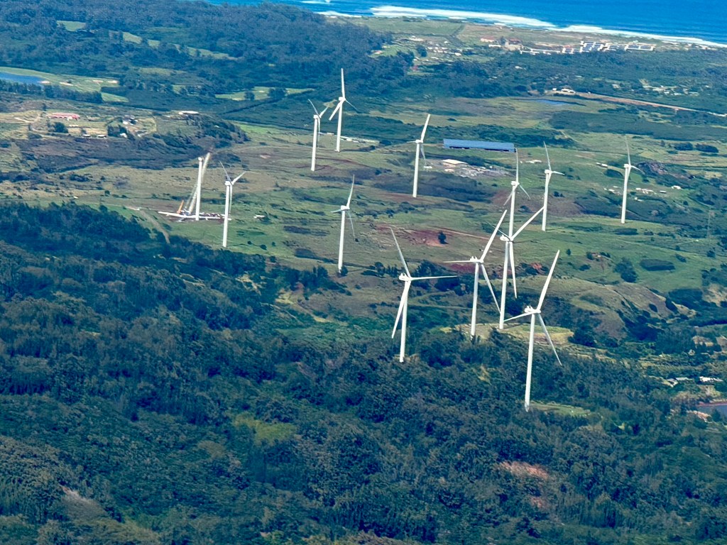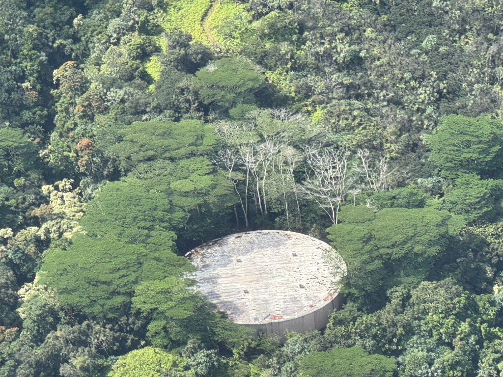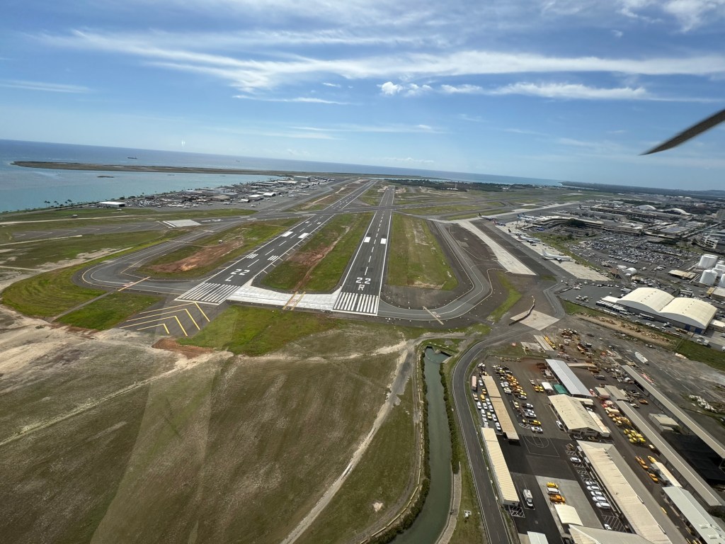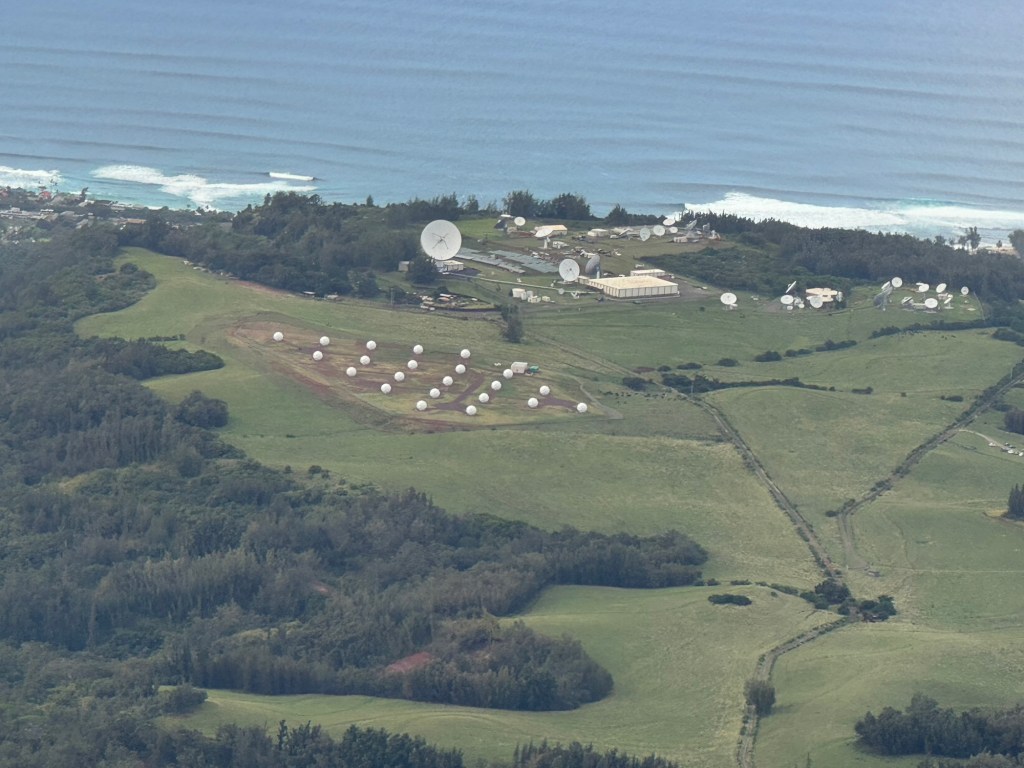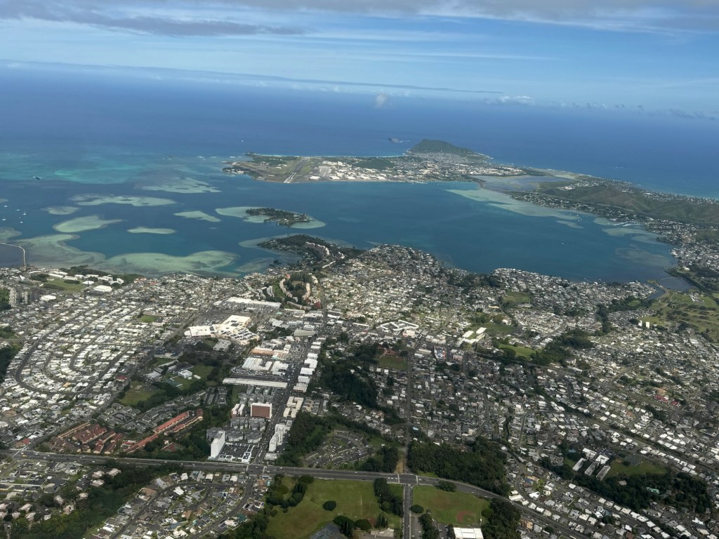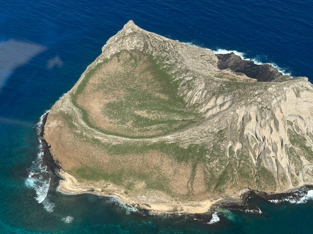 We took off heading West over the ocean past downtown Honolulu, with a great view and picture of our ship docked at Pier 2, then over to Waikiki beach area where Chris did a full 360 degree turn so all could see and take pictures and from the air we were able to see a whale coming out of the ocean and splashing down some yards further on. I believe it is called breaching and was indeed very spectacular. We then proceeded to circumnavigate the island continuing over Diamond head / point volcano / crater where you got a great view over the now extinct volcanos. We cut across at Sandy Beach cutting off Makapu’u point as it sometimes gets a bit rough there. Turning North we followed along the mountain range to our left and the sea to our right over the ground passing Waimanalo, Kailua, Kane’ohe, Kahalu’u seeing the housing, golf courses, surged coastline but gorgeous beaches and what was particularly fun was to see over the top of the many volcanoes seeing Honolulu on the other side of the island. At one point Chris pointed out a spectacular 2 step waterfall in a sort of crevice in the volcanoes which was also spectacular and can only be seen from a helicopter due to the lush thick vegetation surrounding it. He did a full 360 degree turn to be able to see it from all angles. We proceeded to Hau’ula and the Northern tip at Kahuku with the Turtle Bay Resort and Golf Course. Coming around the end of the volcanic range we flew along the beautiful beaches and landscape towards Hale’iwa., Mokule’ia, and Waialua where there was a vast farm of solar panels, many wind turbines / wind “farm” for producing electricity and the observatory. Turning inland on the other side of the volcano range we flew over the enormous Dole pineapple farm. It is unmistakable as there is a very large pineapple in the center of the world’s largest hedge maze and a lot of buildings with what seemed like endless acres of pineapple production. A must visit next time. At this point we were heading South over Wahiawa and Mililani and over Pearl City, and Pearl Harbour flying over where we spent the morning so we were able to see from above all we had seen from the ground in the morning which was amazing. Then past the Honolulu International Airport and back to the Blue Hawaiian terminal. An absolutely breathtaking and spectacular experience.