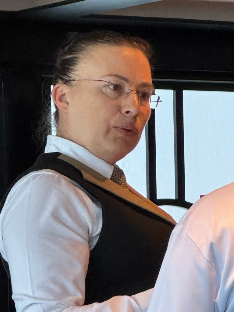 Then Captain Inger Thorhague was interviewed by Entertainment Director Michael Harvey. It was really interesting to hear her “story” from a young child growing up in the Faroe Islands entering the commercial shipping industry and eventually deciding to join a cruise line so sent applications to all the Cruise Lines with Cunard replying first with an offer to start as a Second Officer. She was picked to be the Captain of the Queen Anne and spent the last 8 months of her manufacture and kitting out before being put into service. We had a great time spending the first 2 months of the ship’s maiden voyages with her and greatly enjoy being on her Maiden World Voyage. She got some tough questions from the audience and was strict, but polite in her answers. She was very impressive in the way she managed the interaction and brought a renewed admiration for her as the Leader / Master of the ship. By the way the Master refers to the Exam and Certification to become a Captain and the word Captain refers more to her as the Leader of the ship.